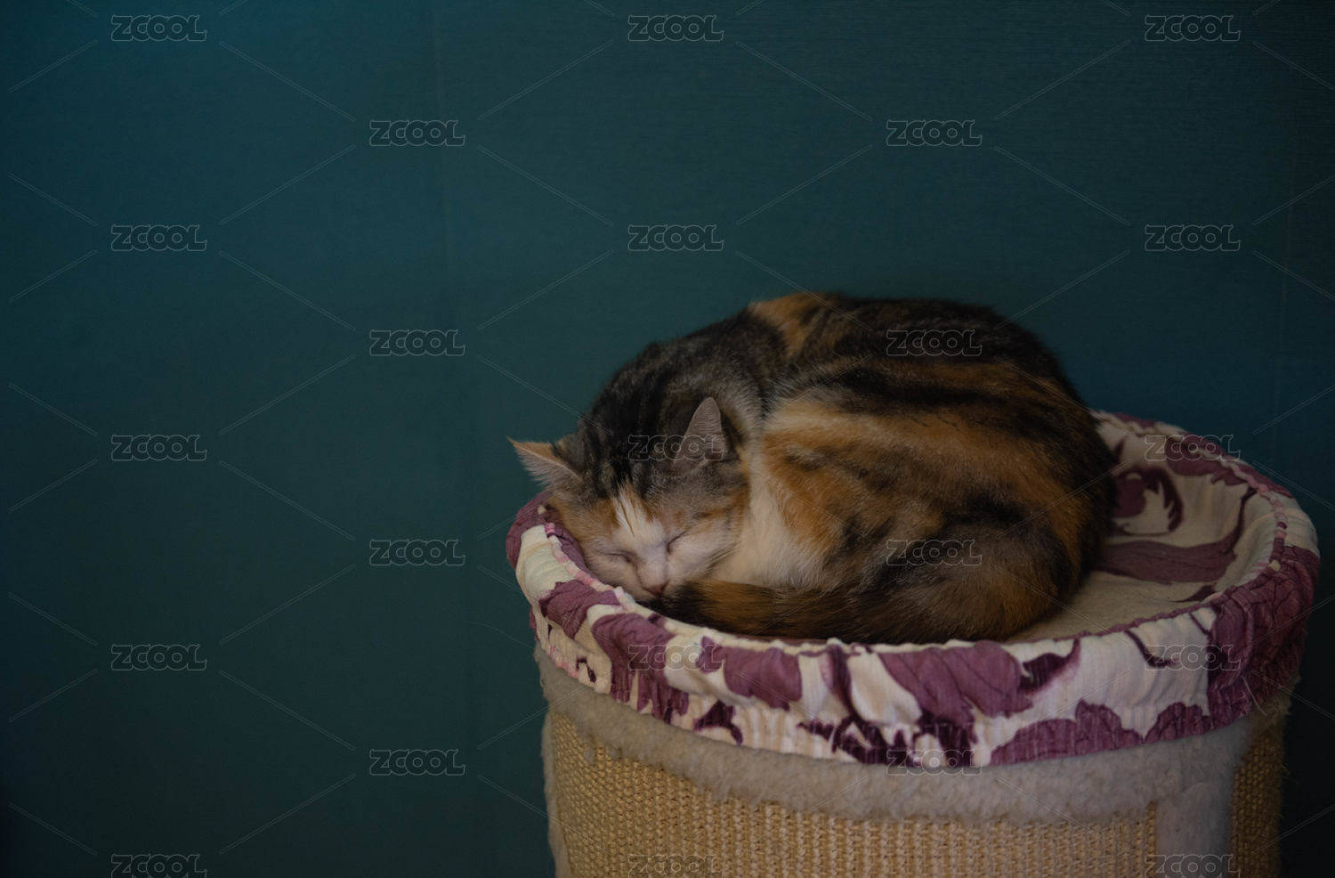 一只貓咪趴在柳編的窩里面睡覺(jué)