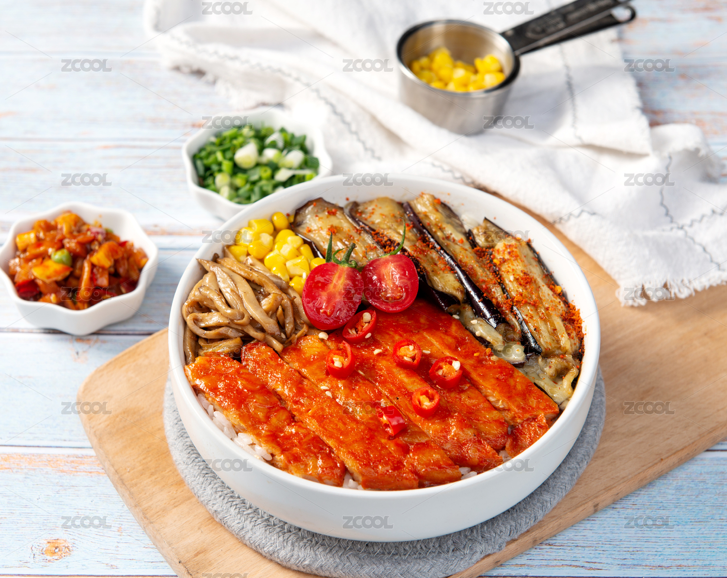 自然光下的雞排茄子雙拼套餐米飯