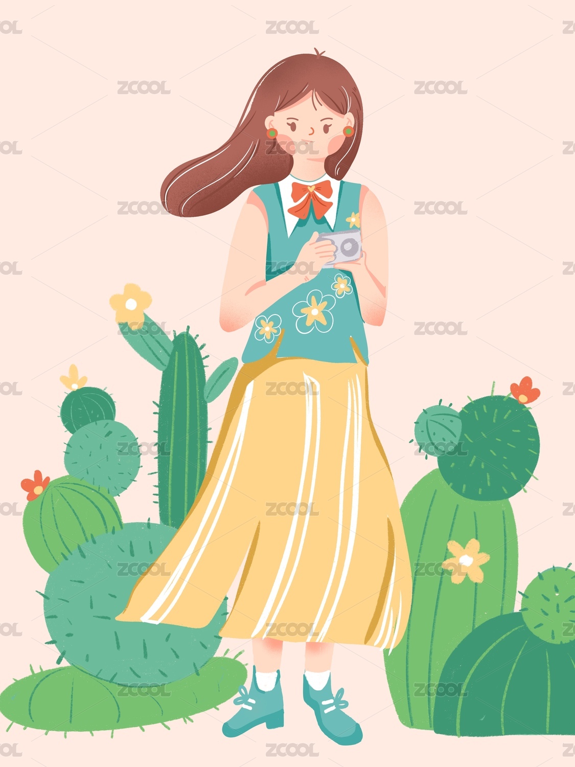 女孩在春天拿著相機(jī)拍照人物手繪插畫(huà)