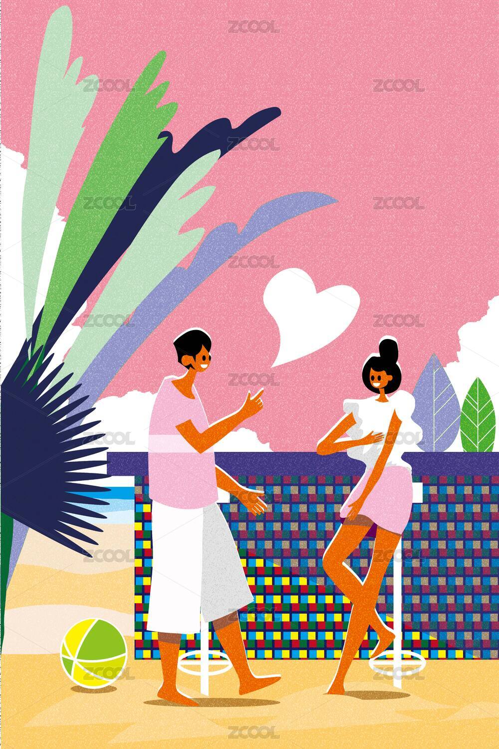 夏天休閑生活時(shí)尚情侶人物手繪矢量插畫(huà)
