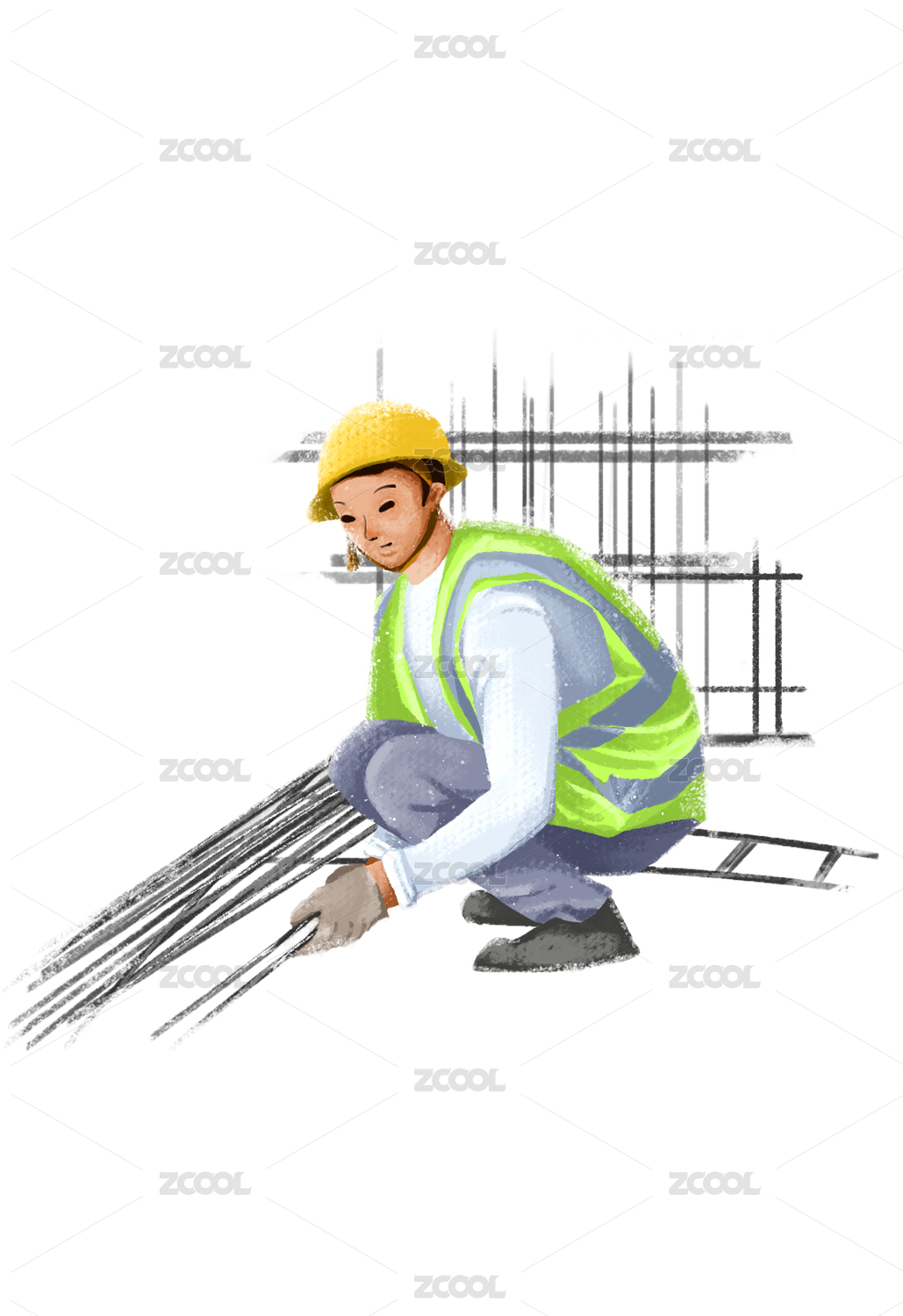 工地上搬鋼筋的建筑工人人物手繪插畫(huà)