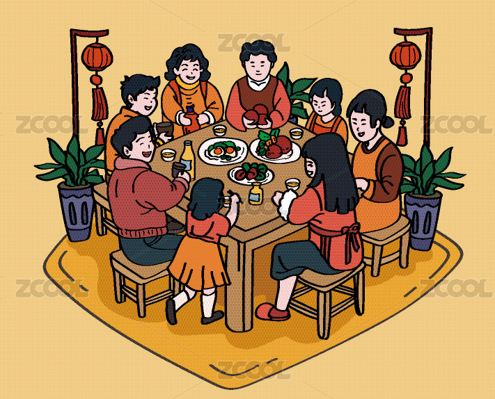 人物手繪一家人聚餐吃飯團(tuán)圓年夜飯插畫(huà)
