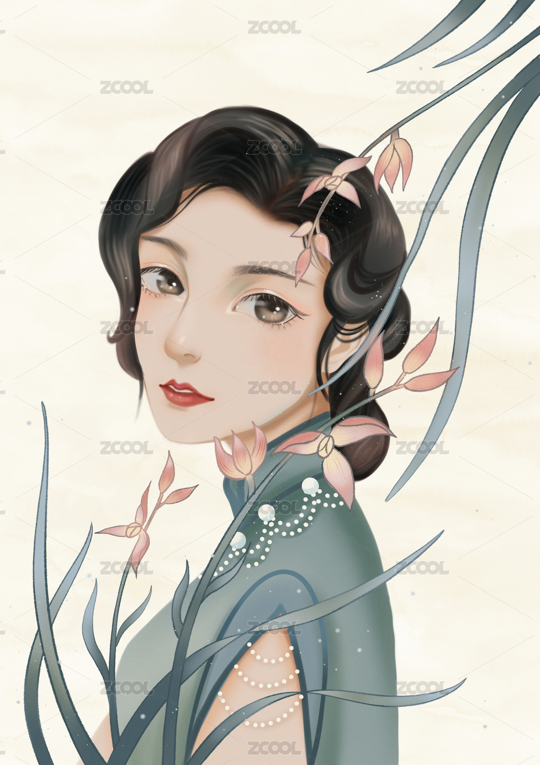一月蘭花民國(guó)旗袍國(guó)潮人物手繪插畫(huà)