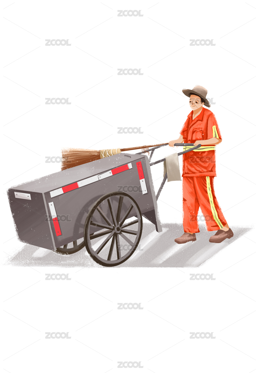 路邊推著垃圾車(chē)的環(huán)衛(wèi)工人人物手繪插畫(huà)