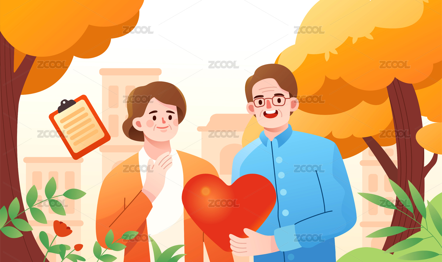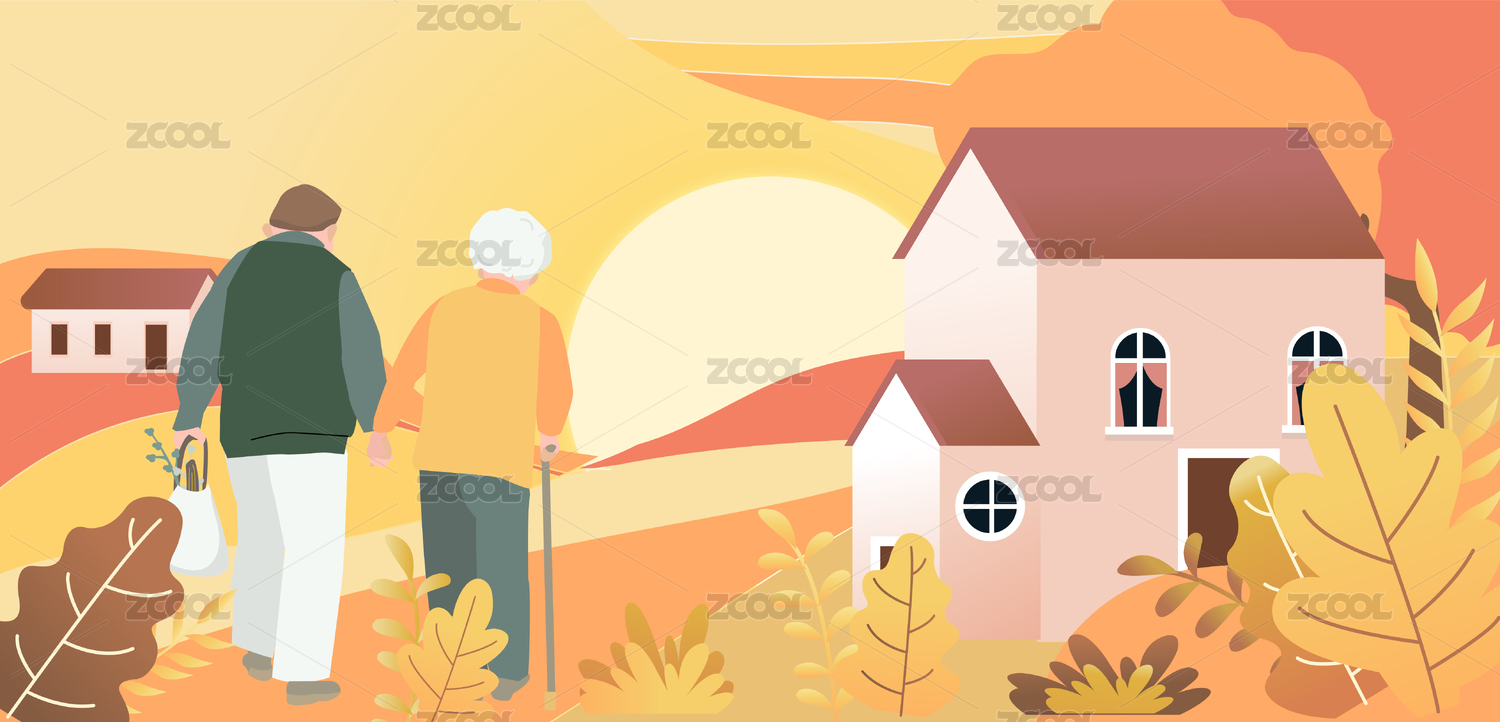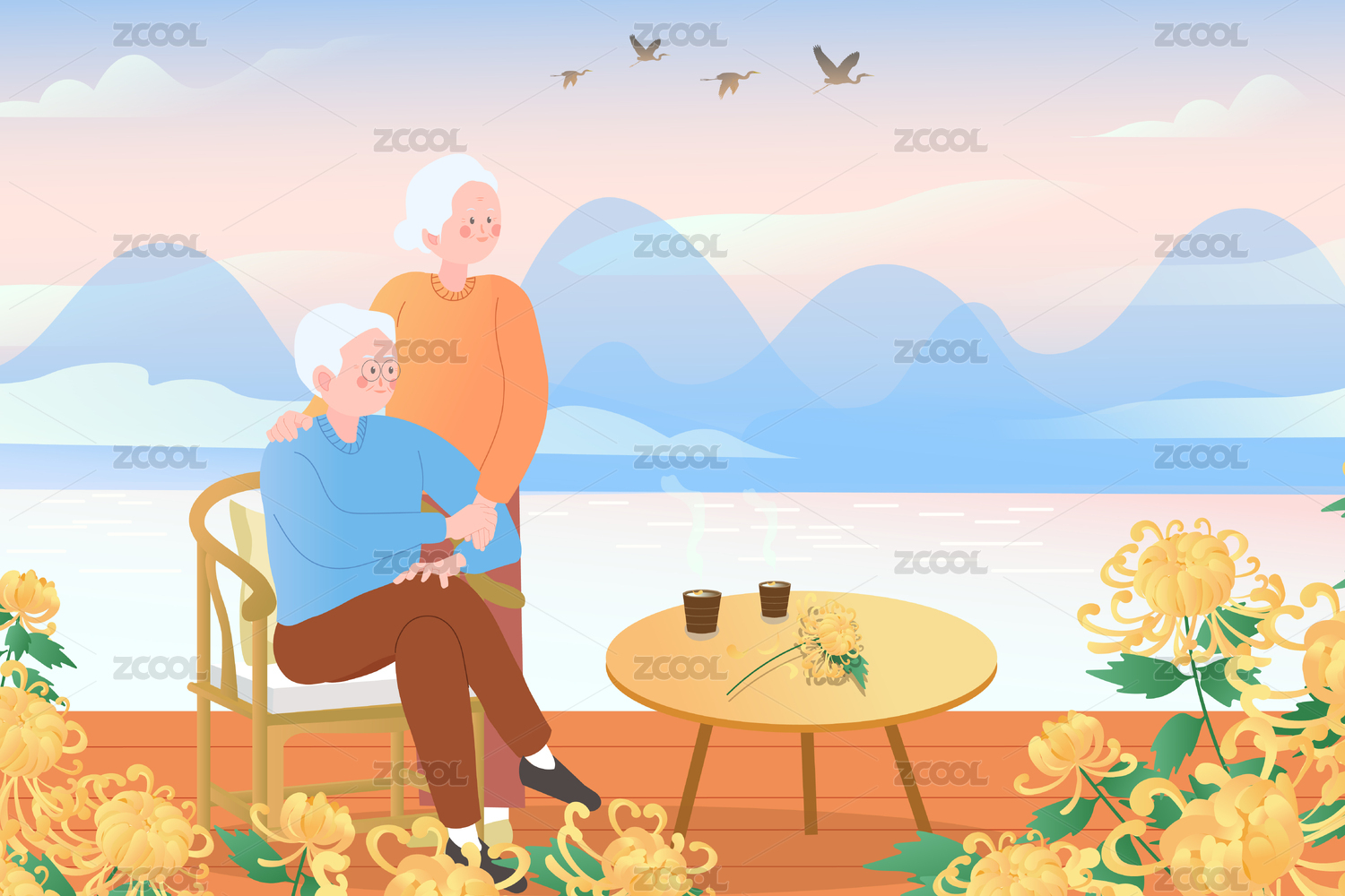 重陽節(jié)菊花與老夫婦橫版矢量插畫