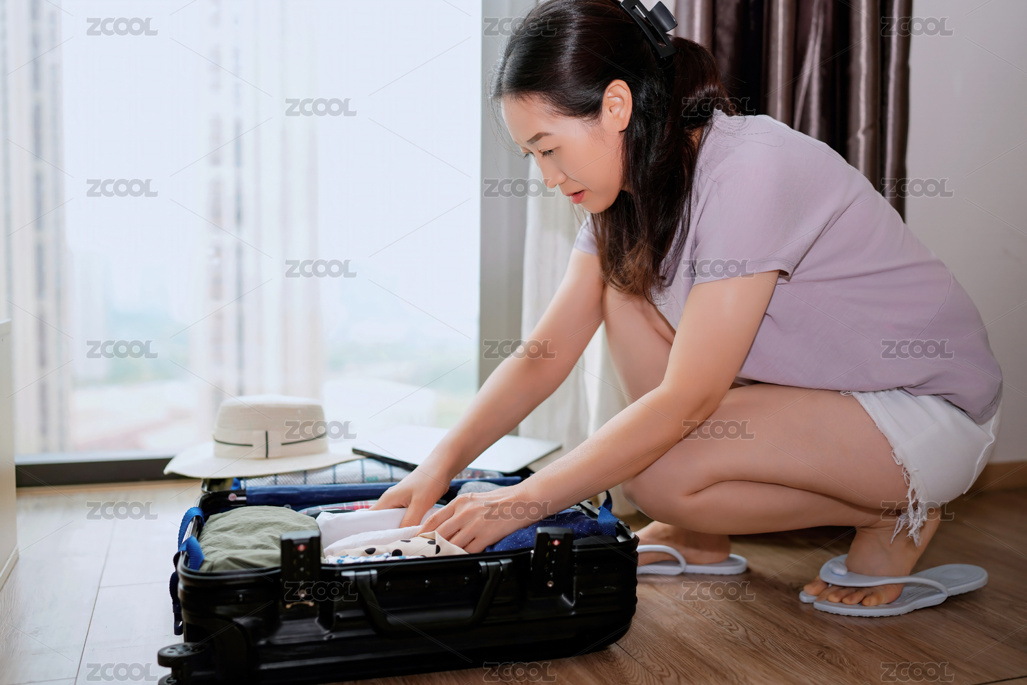 年輕女子在現(xiàn)代室內(nèi)打包旅行行李箱