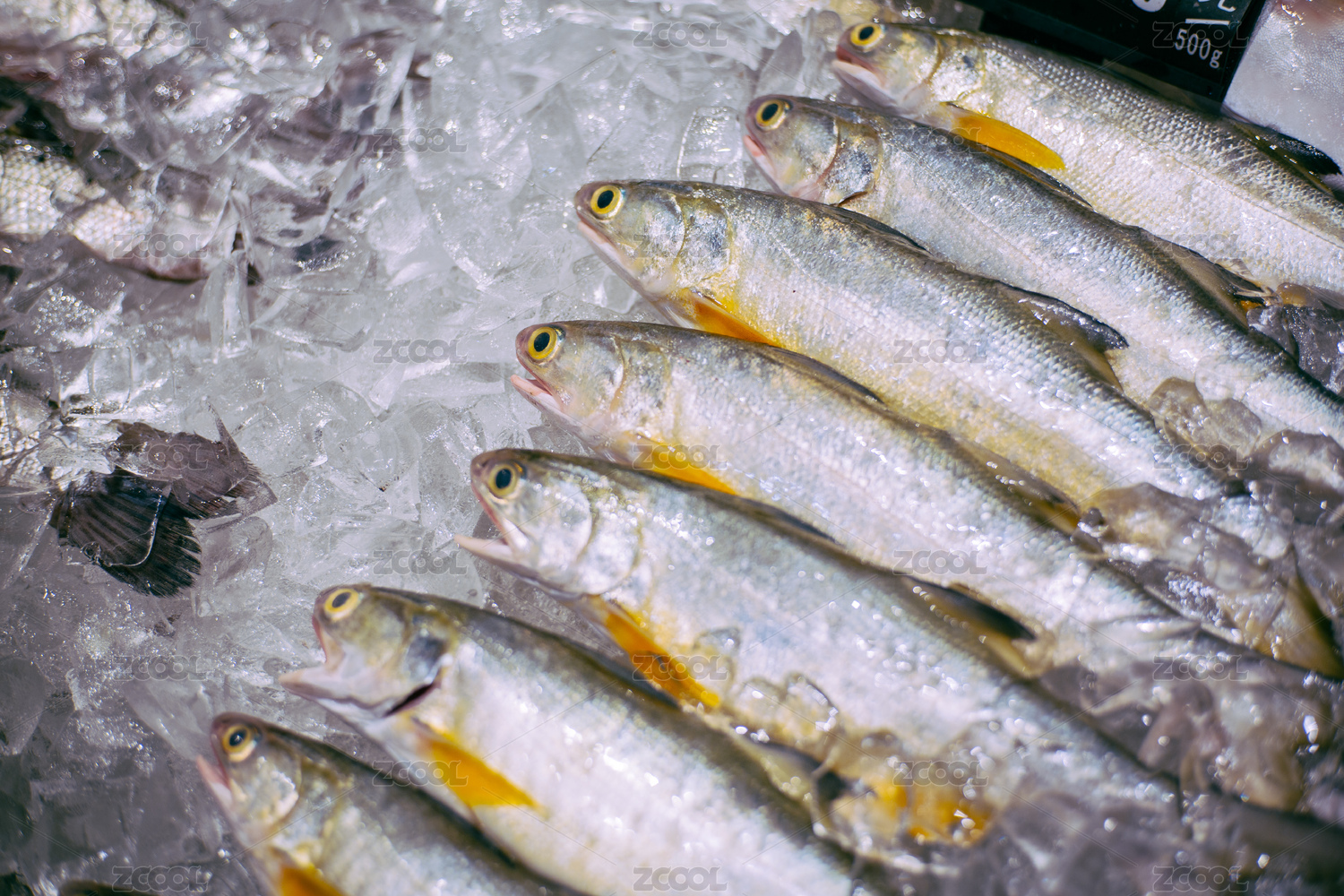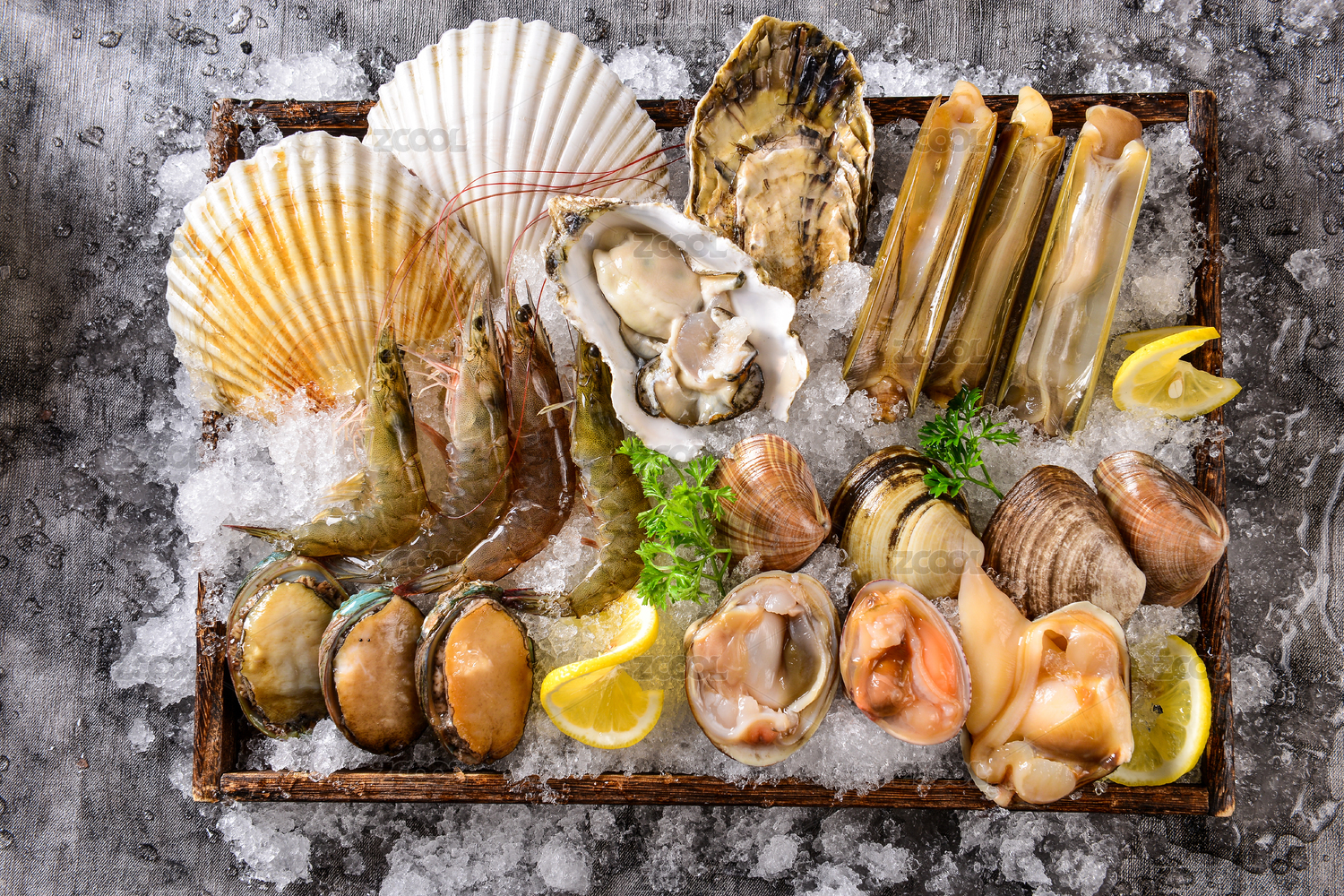 一堆海鮮集合海鮮拼盤(pán)放在冰塊上