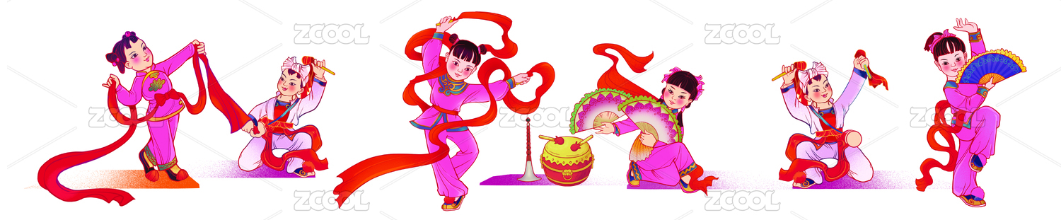 紅色卡通喜慶男性彩帶敲腰鼓元素