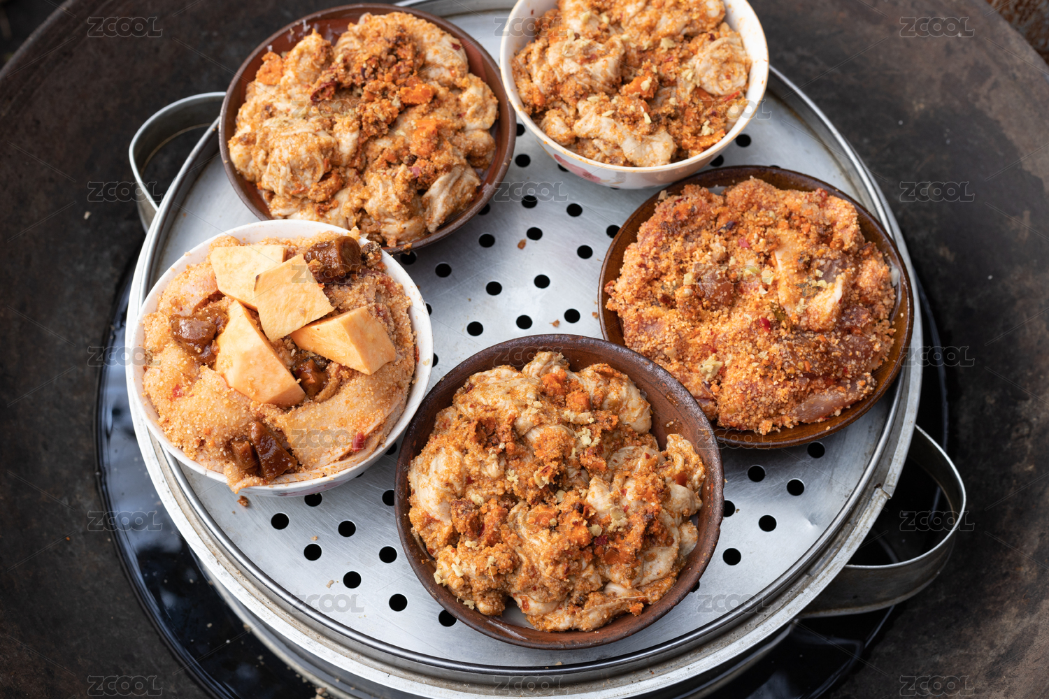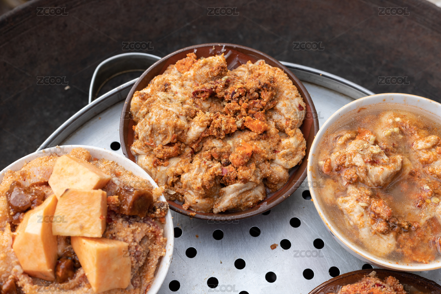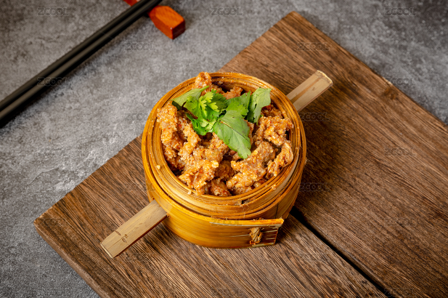 小蒸籠上的川味粉蒸肉粉蒸肥腸