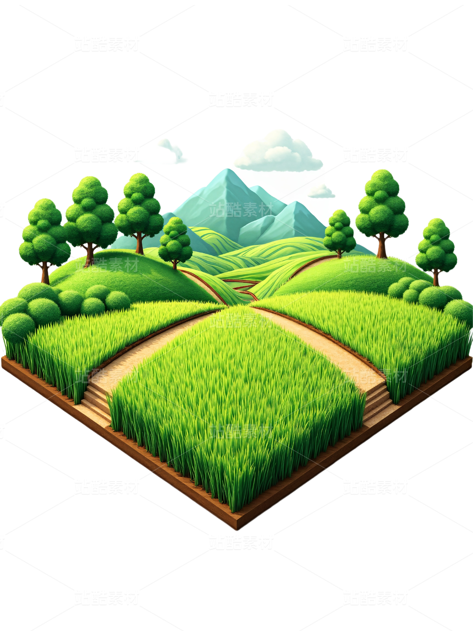 農(nóng)田樹木遠(yuǎn)山組成的田野風(fēng)格PNG免摳素材2.5D、3D