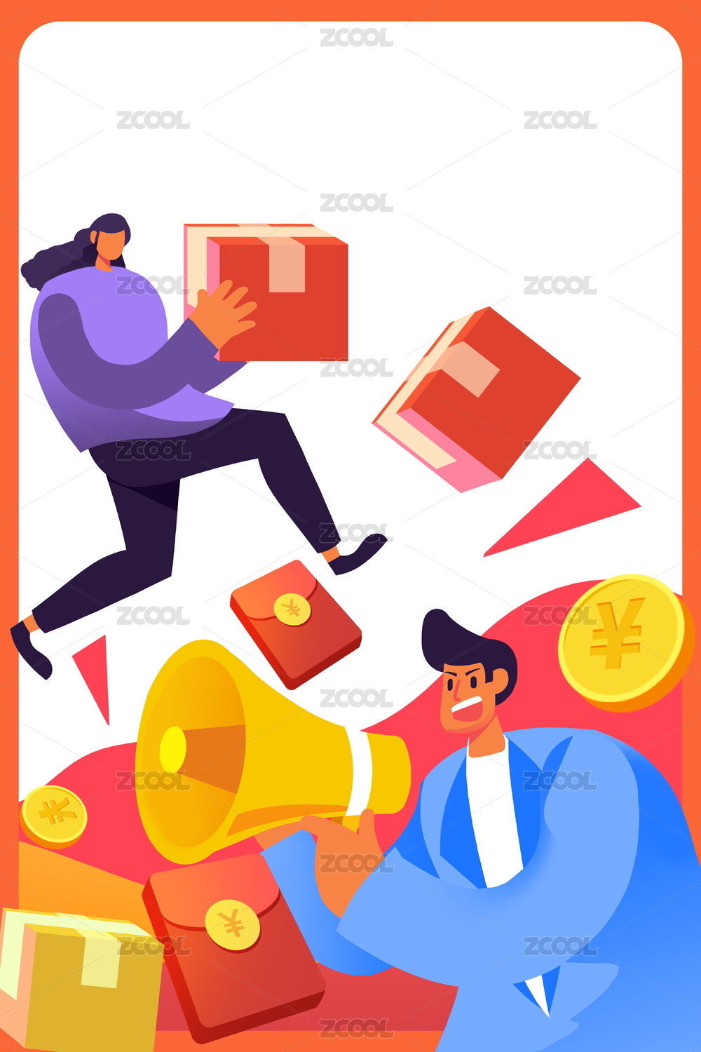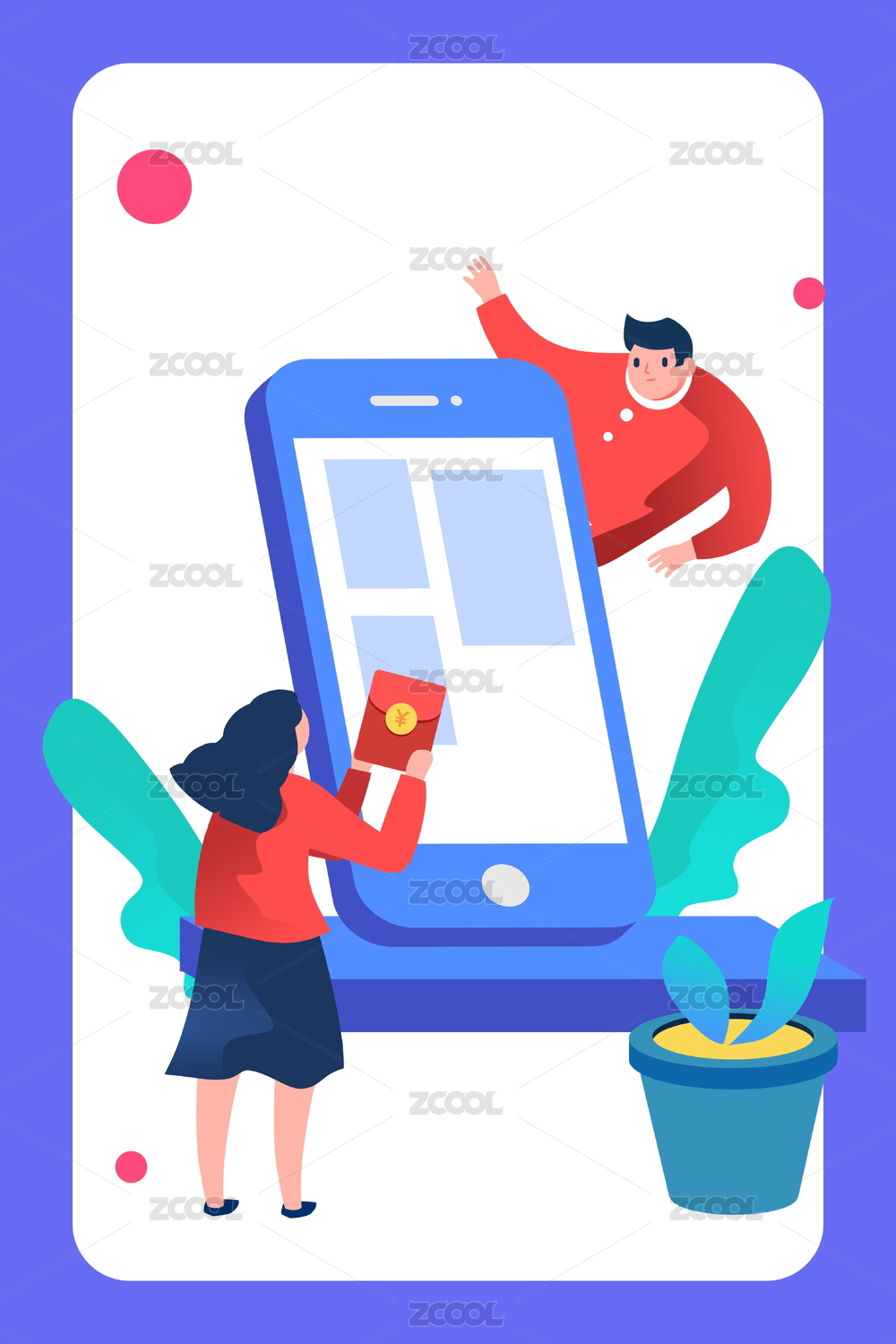 卡通手繪男人女人手機購物紅包推廣活動金融插畫