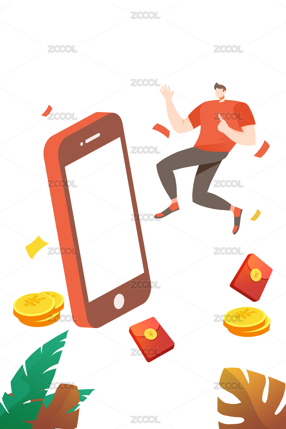 卡通手繪男人手機購物紅包推廣活動金融插畫