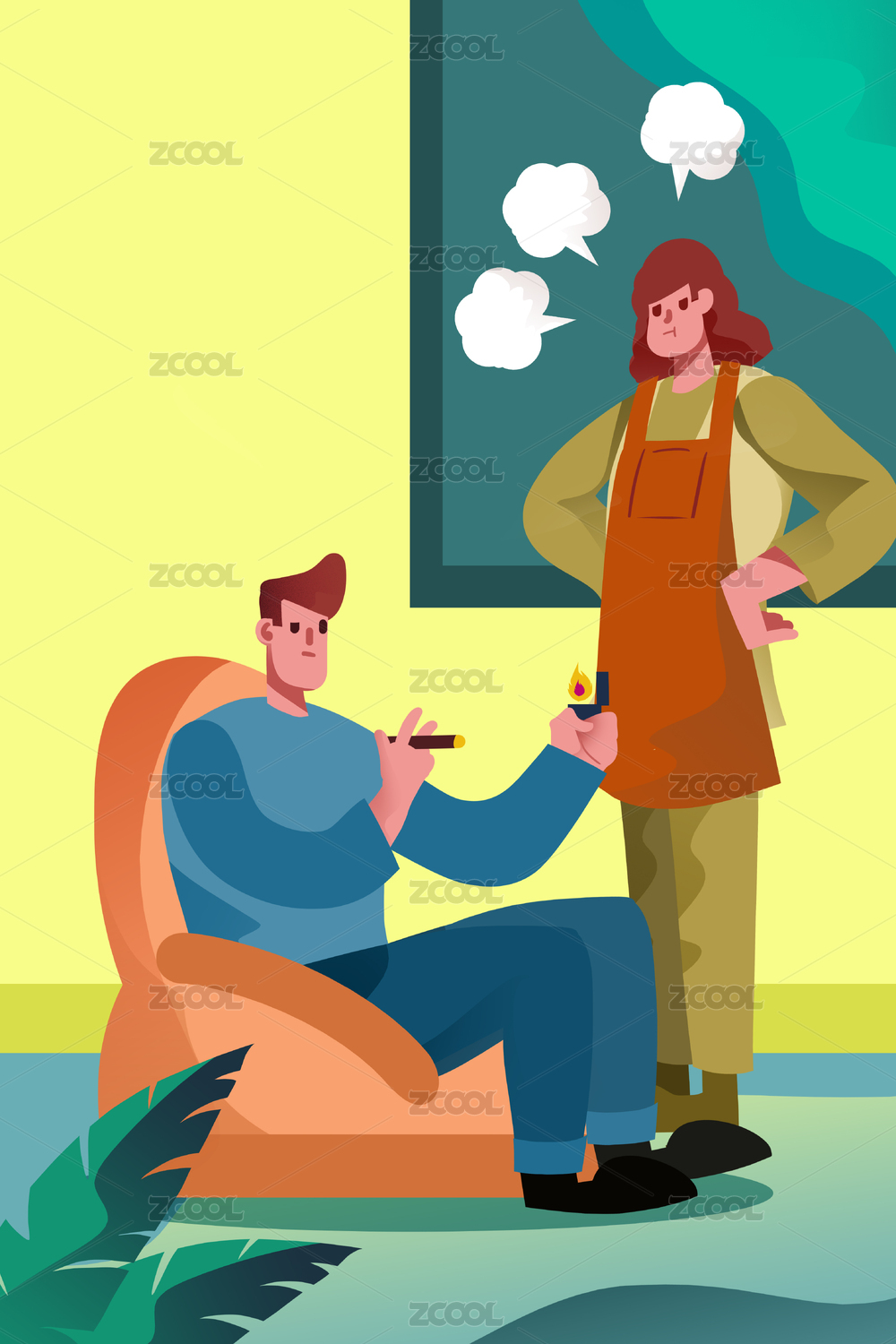 卡通手繪男人抽煙女人生氣閃屏海報插畫