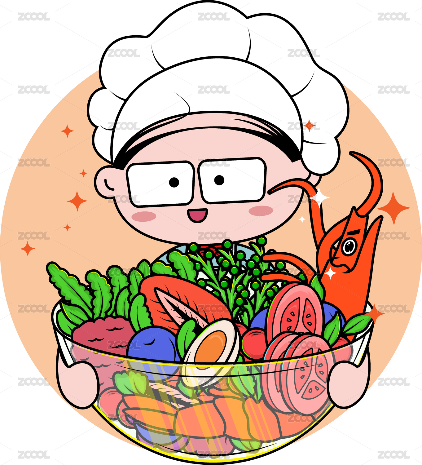 手繪卡通男人廚師和沙拉美食矢量插畫
