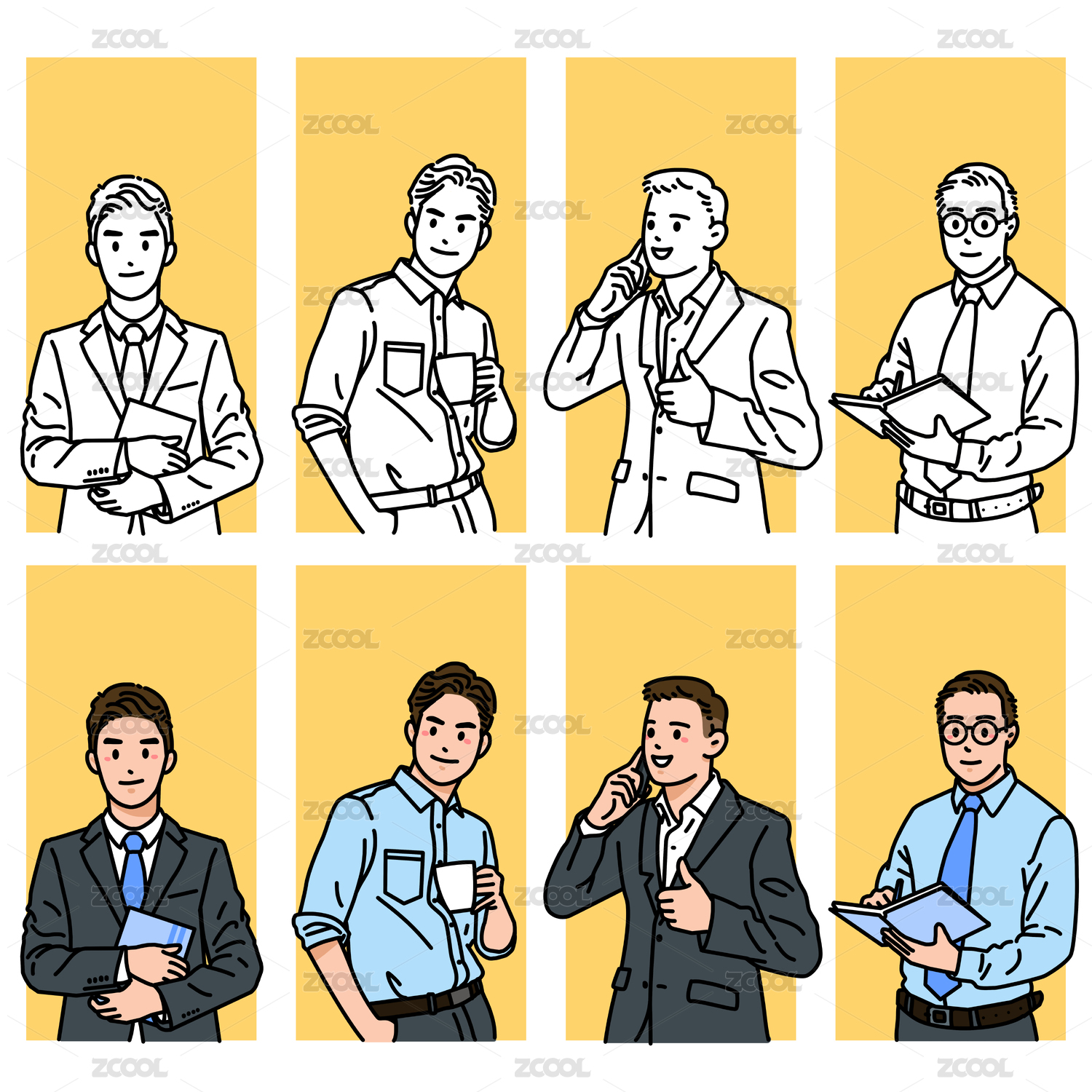 四個簡筆畫卡通人物商務西裝襯衫男人