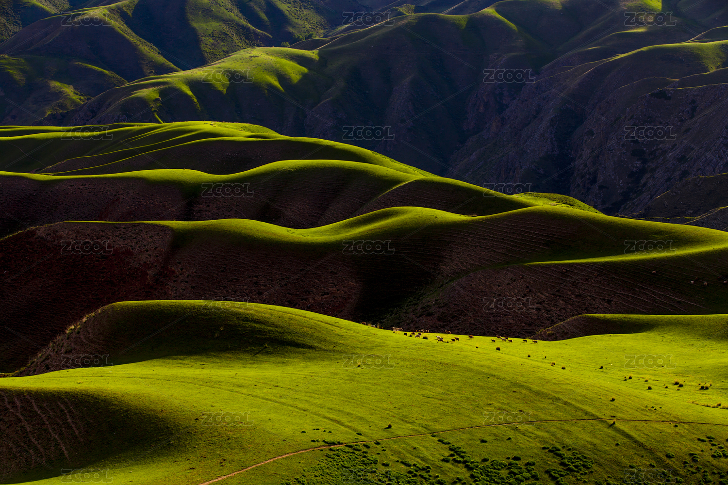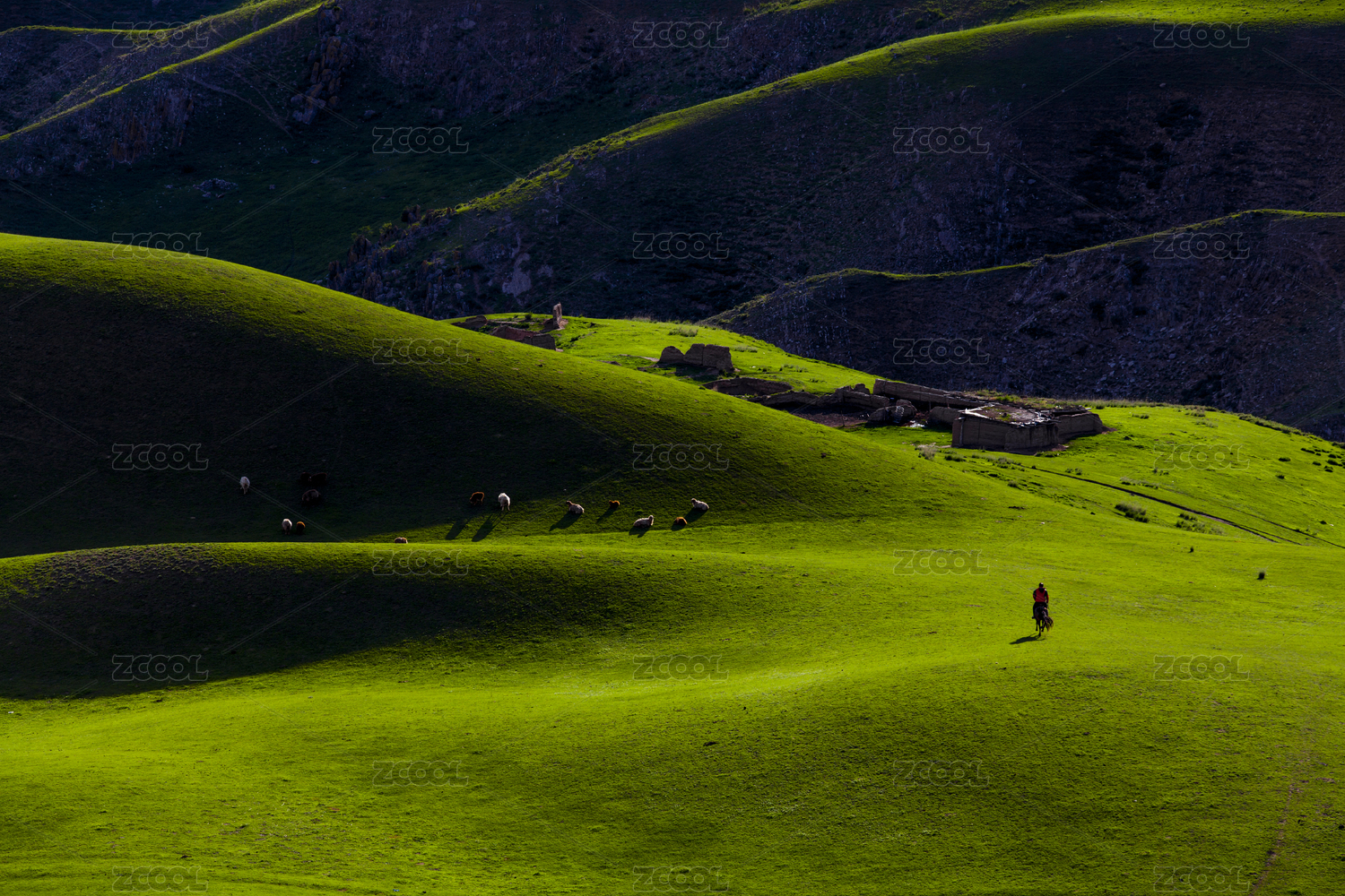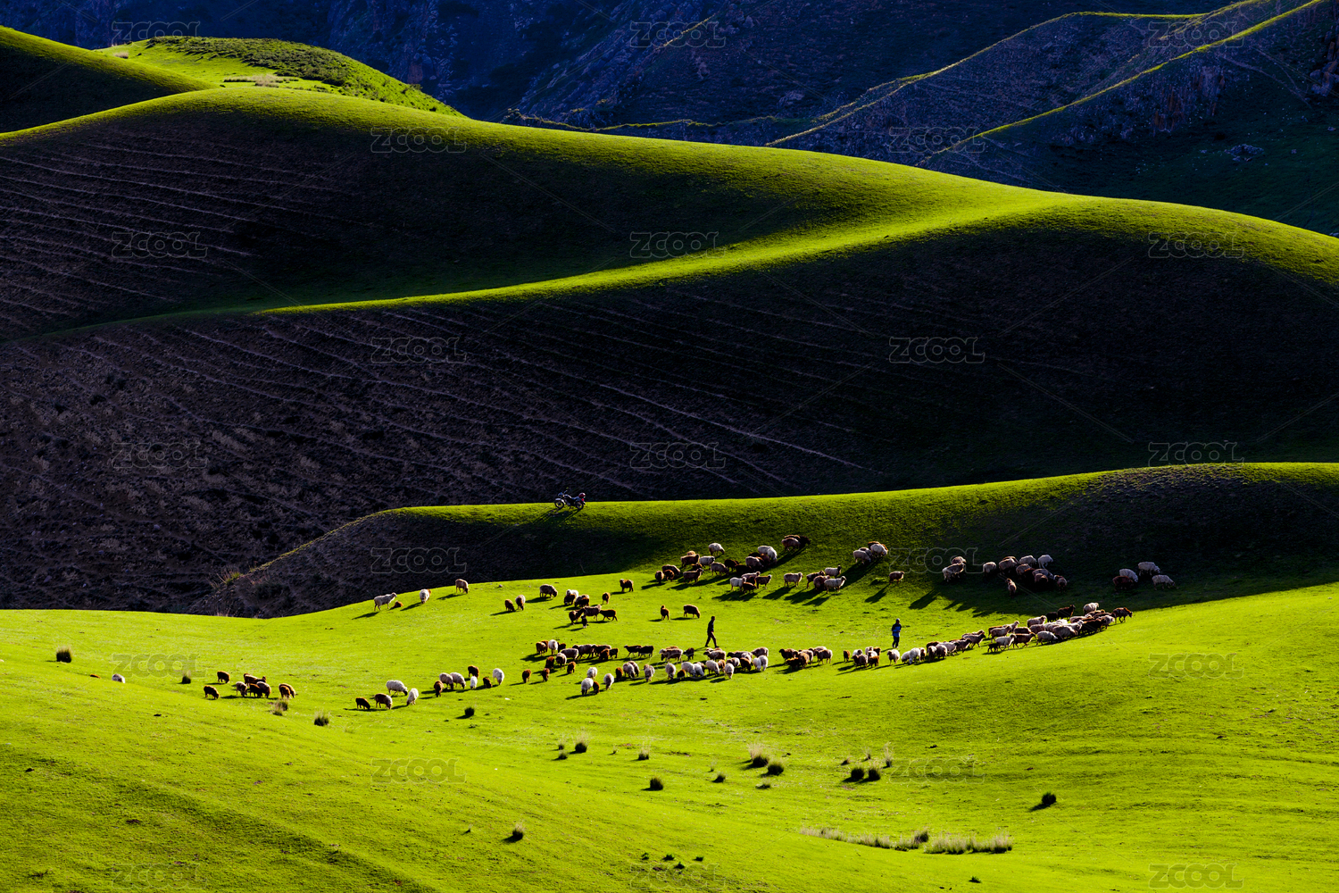 中國新疆起伏綠色草原放牧