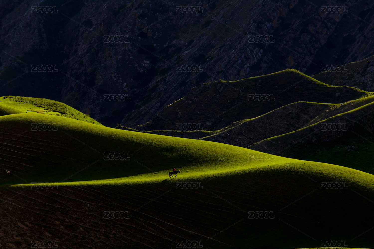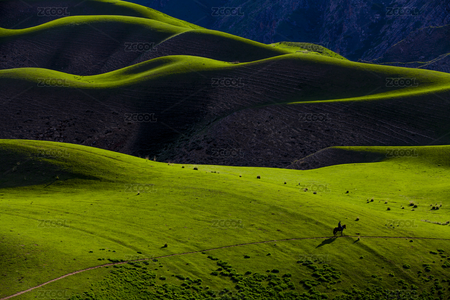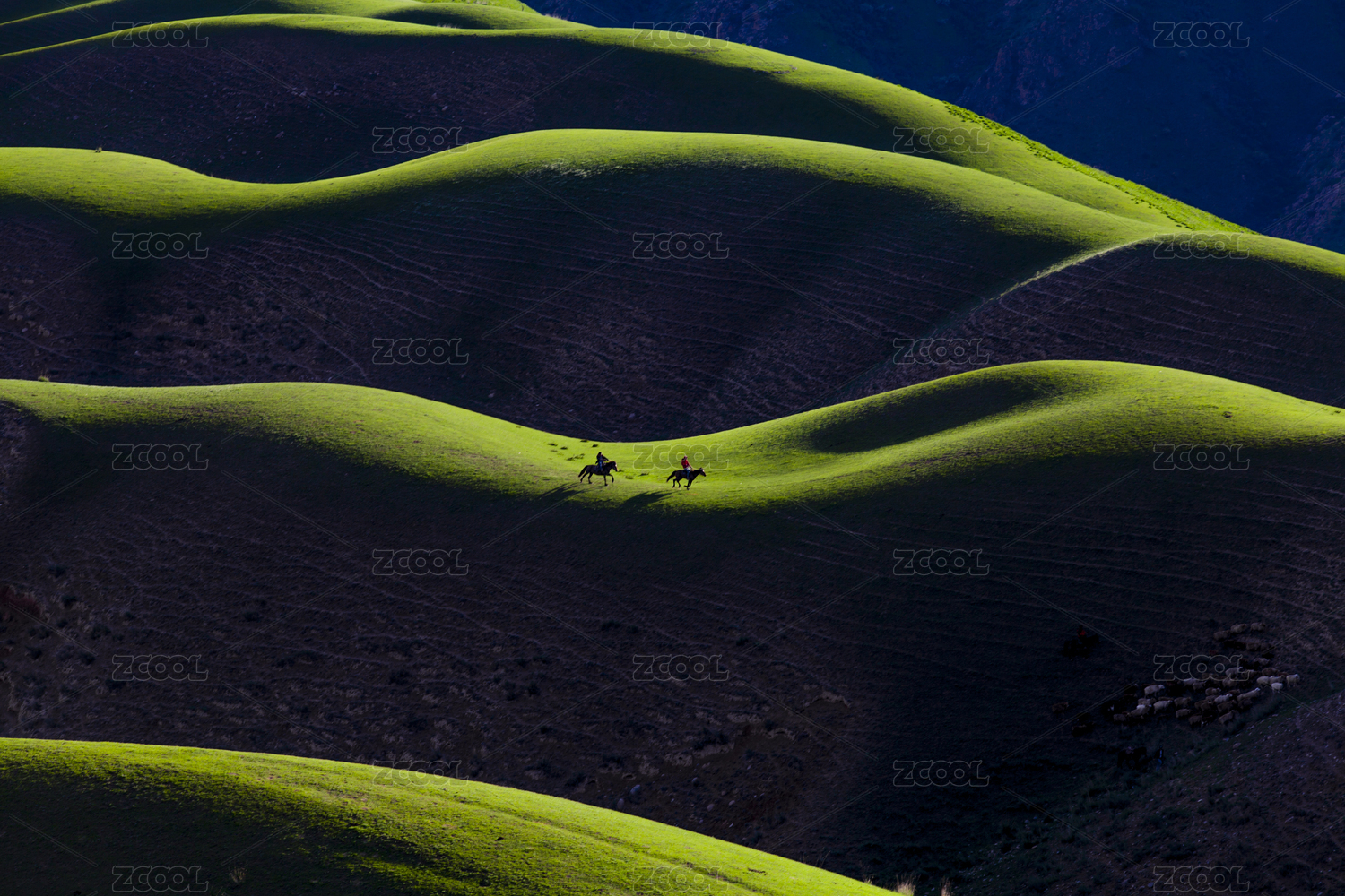 中國新疆起伏綠色草原放牧
