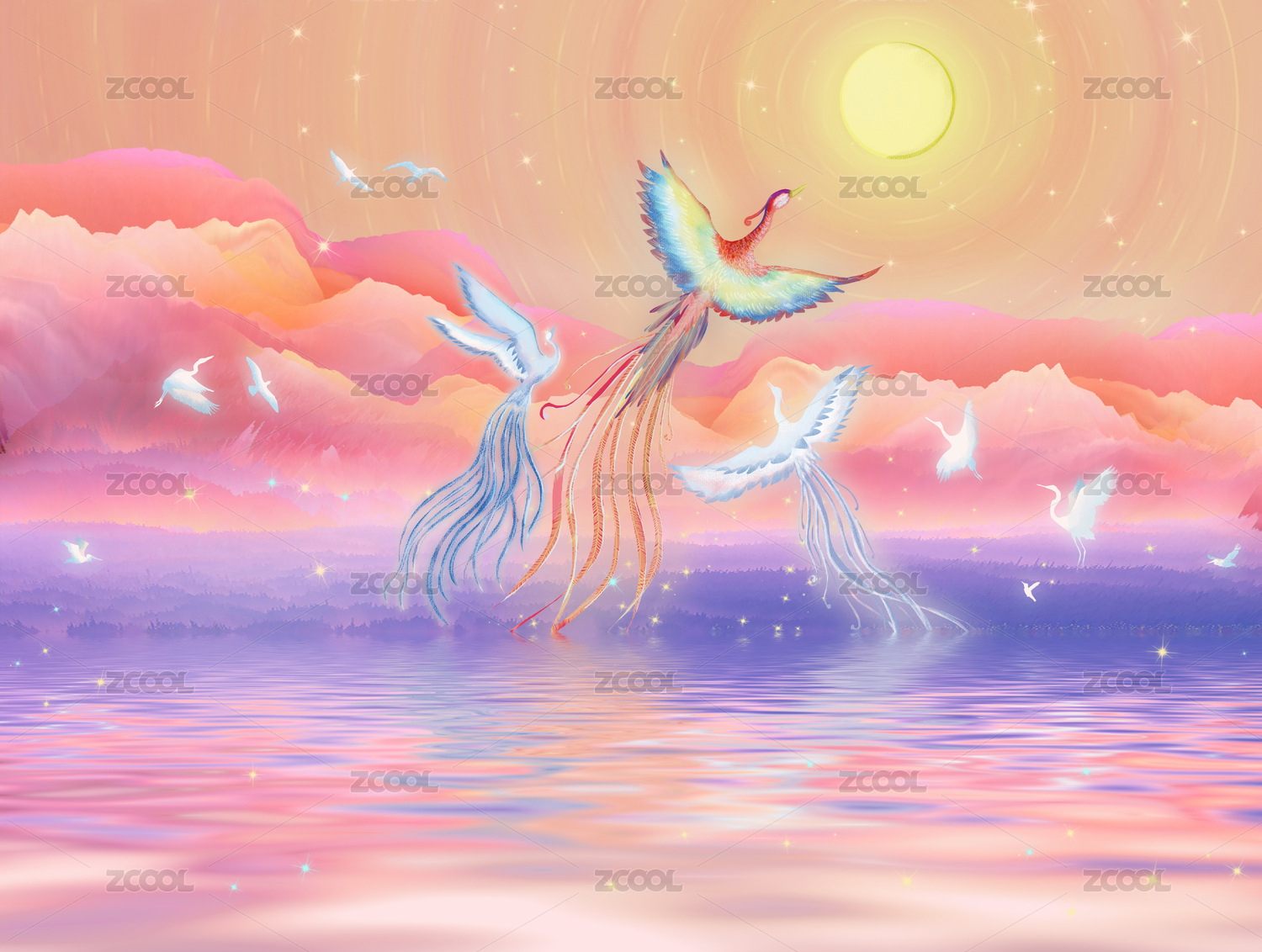 中秋節(jié)夜空下,美麗的鳳凰和一群仙鶴飛向月亮,流動起伏的河水發(fā)出淡淡光彩插畫背景海報(bào)