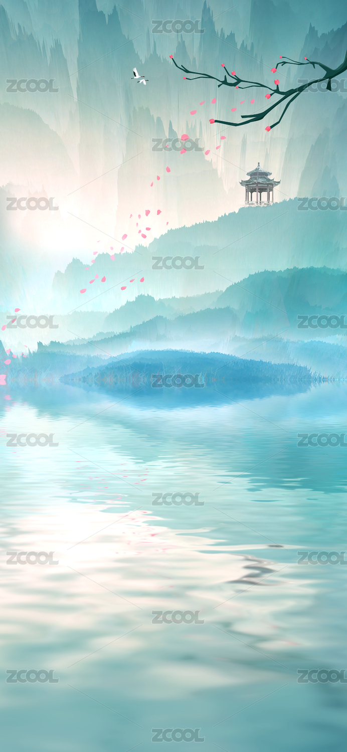 早晨山上有一座亭子,鮮花隨風(fēng)飄落并倒映在波動起伏的湖水面上中國風(fēng)插圖背景海報(bào)