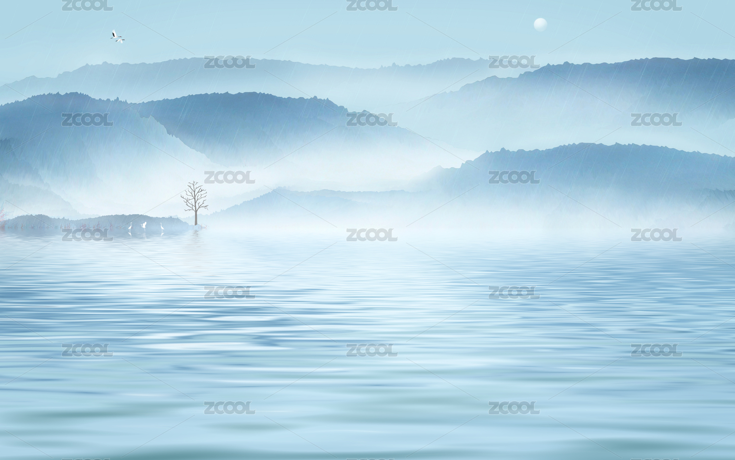云霧彌漫著波動起伏的湖面,大雁飛過起伏崎嶇的高山中國風(fēng)山水插畫背景海報(bào)