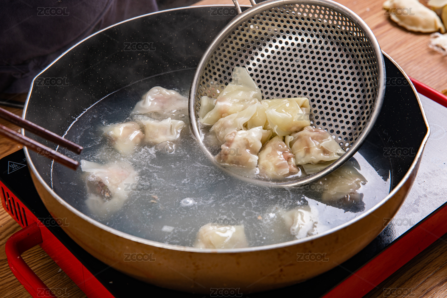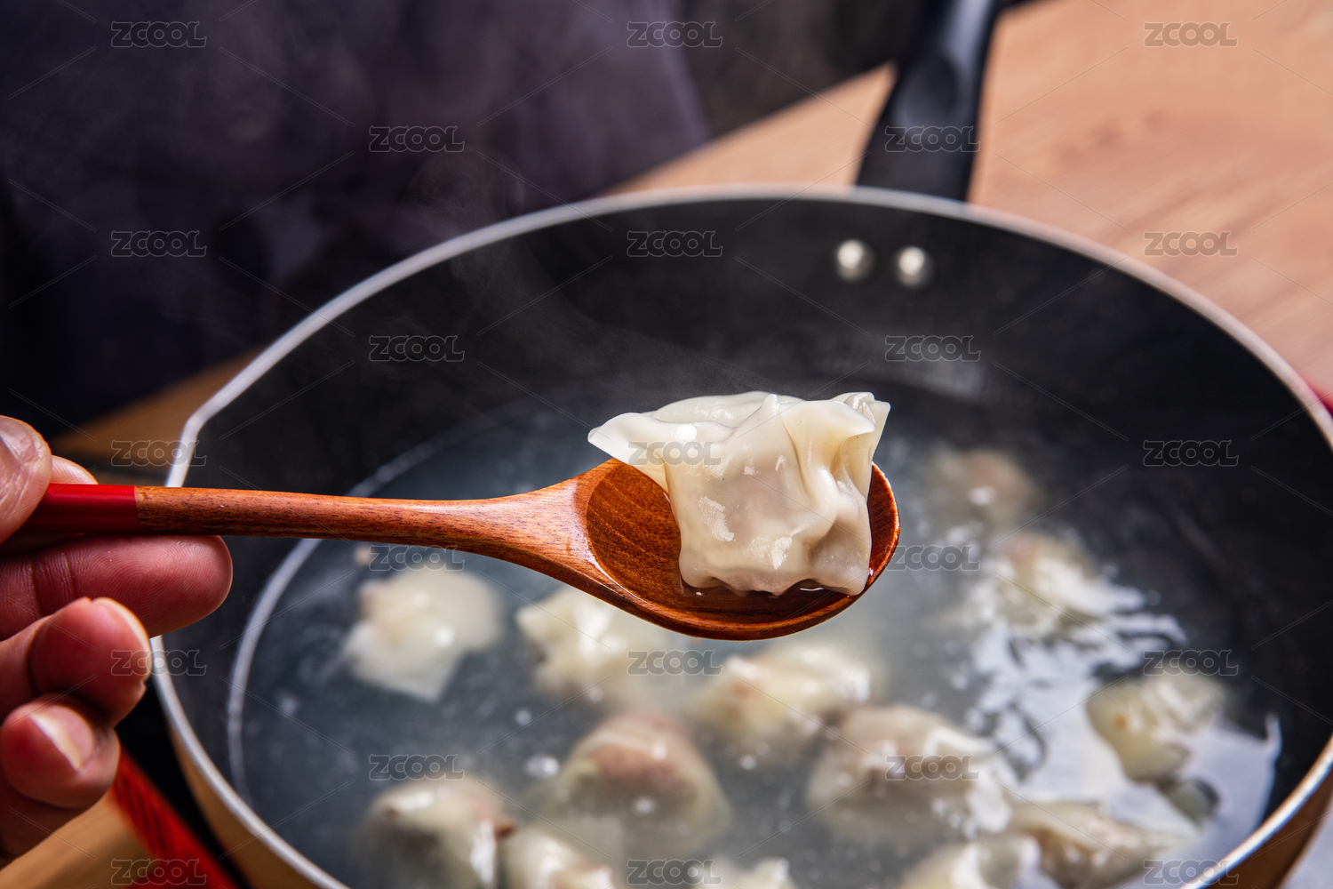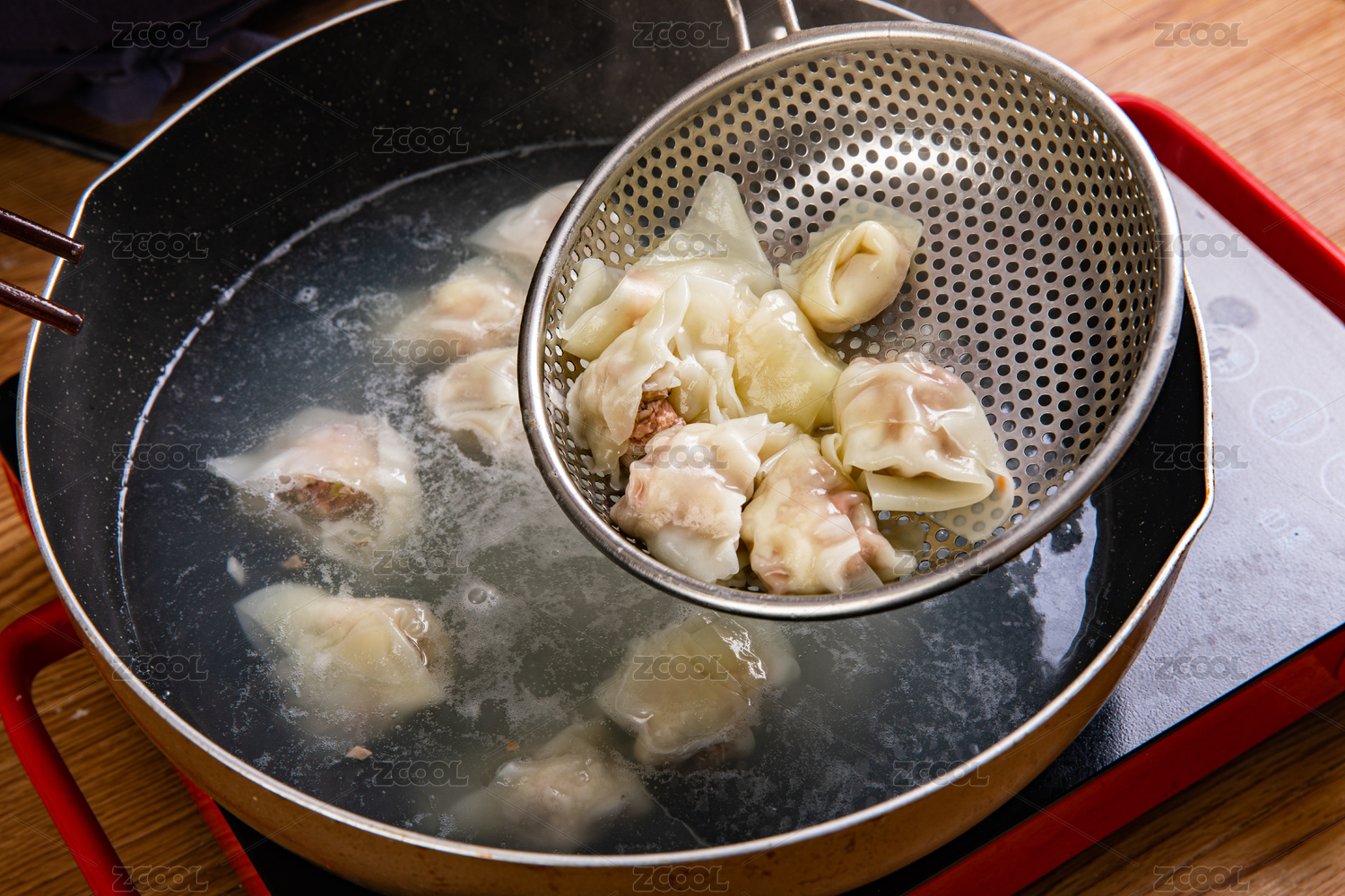 漏勺和筷子一起在鍋中撈煮熟的餛飩