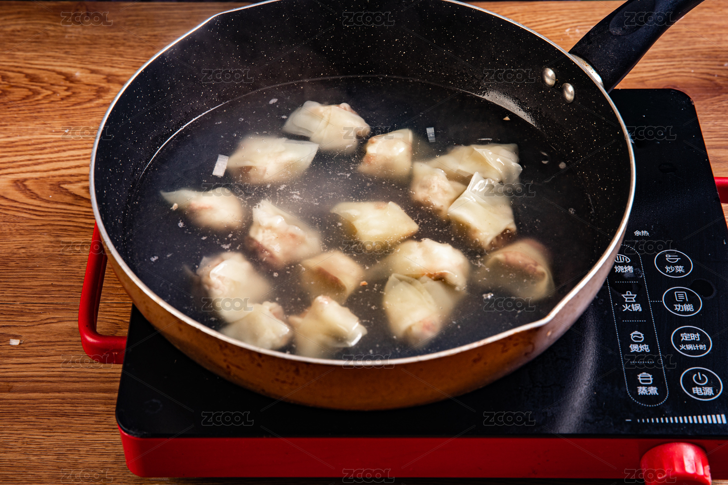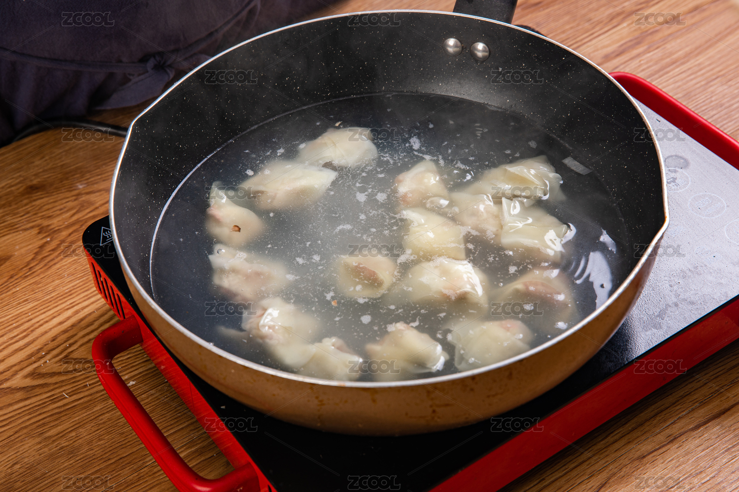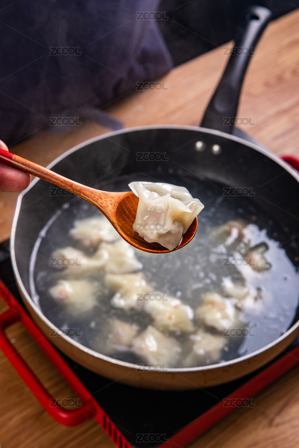 漏勺和筷子一起在鍋中撈煮熟的餛飩