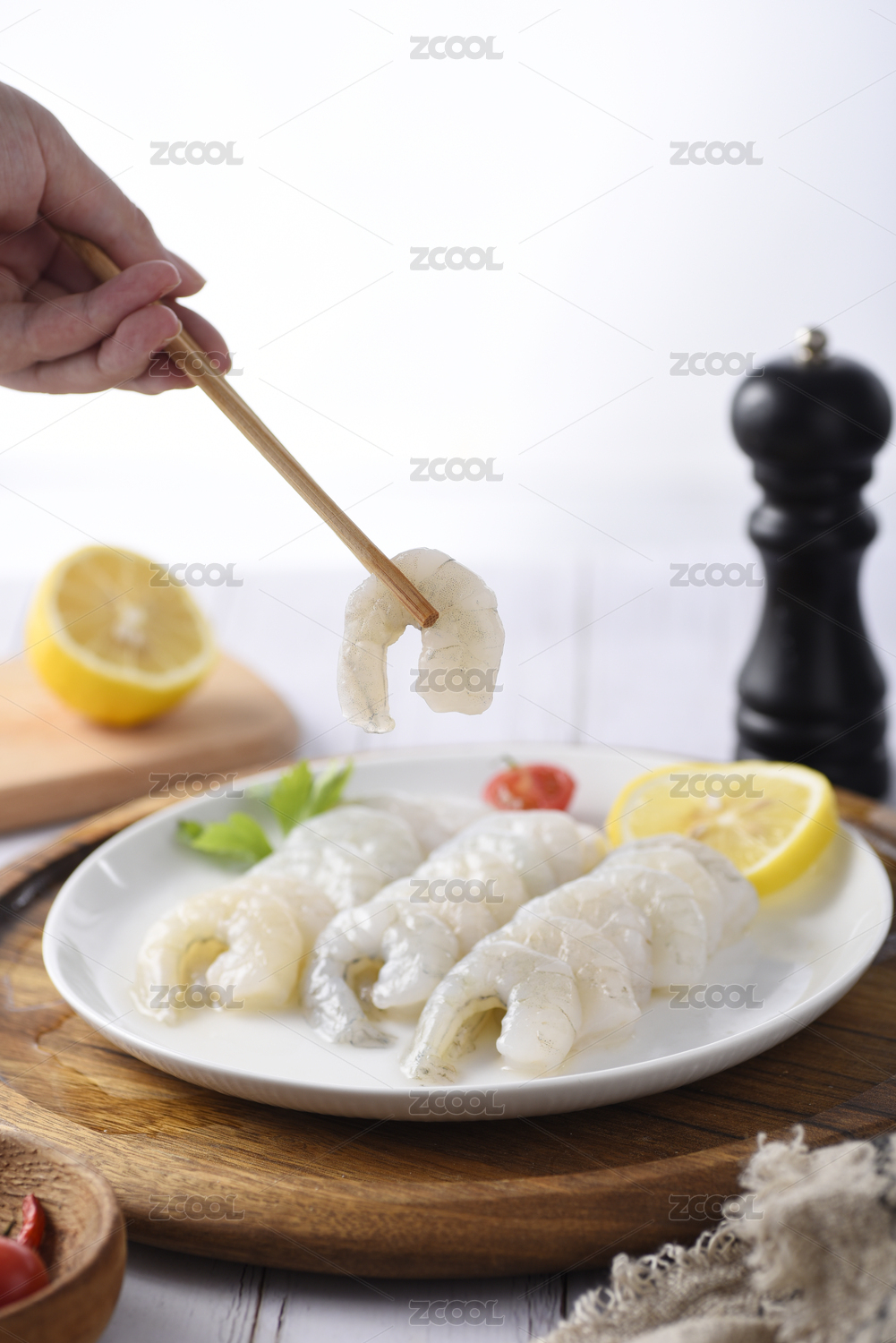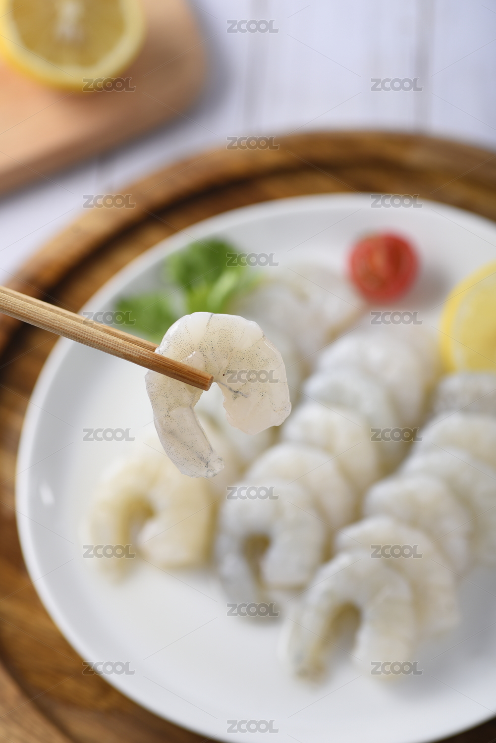 白色背景下切菜板上的筷子夾蝦仁特寫鏡頭