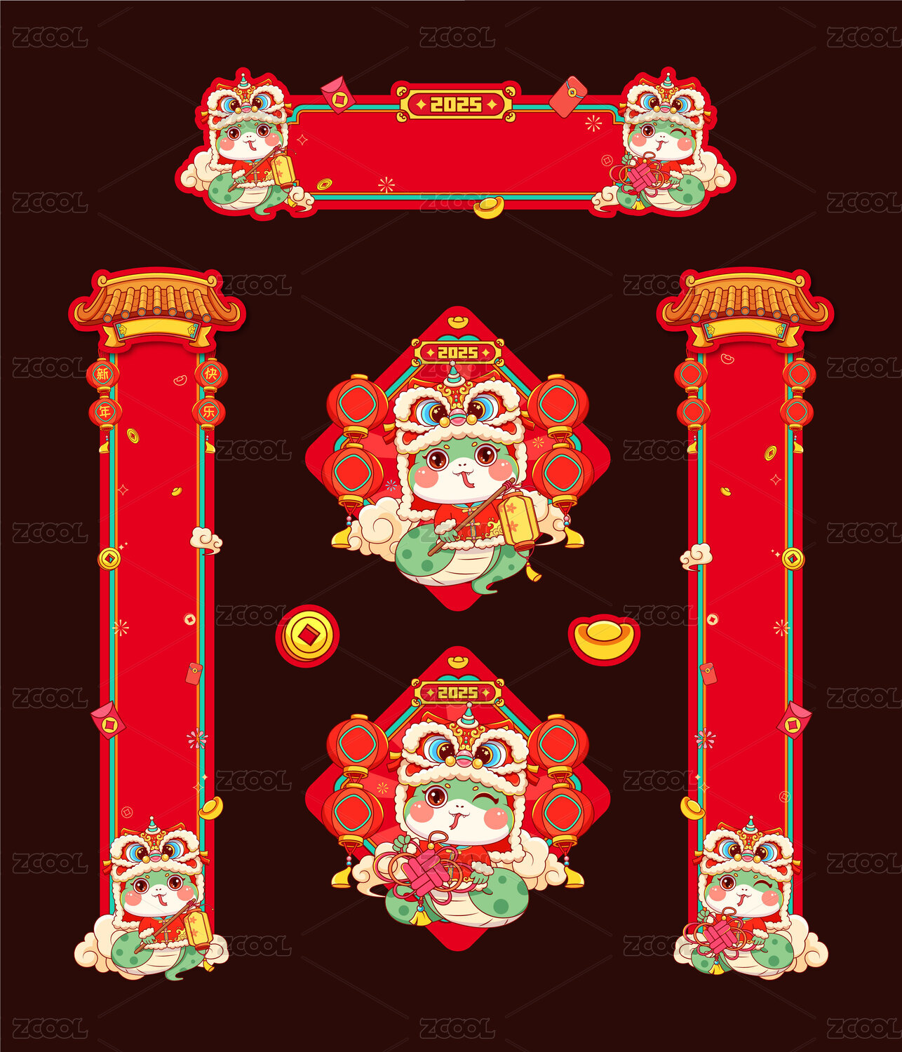 蛇年可愛(ài)卡通蛇對(duì)聯(lián)設(shè)計(jì)模板