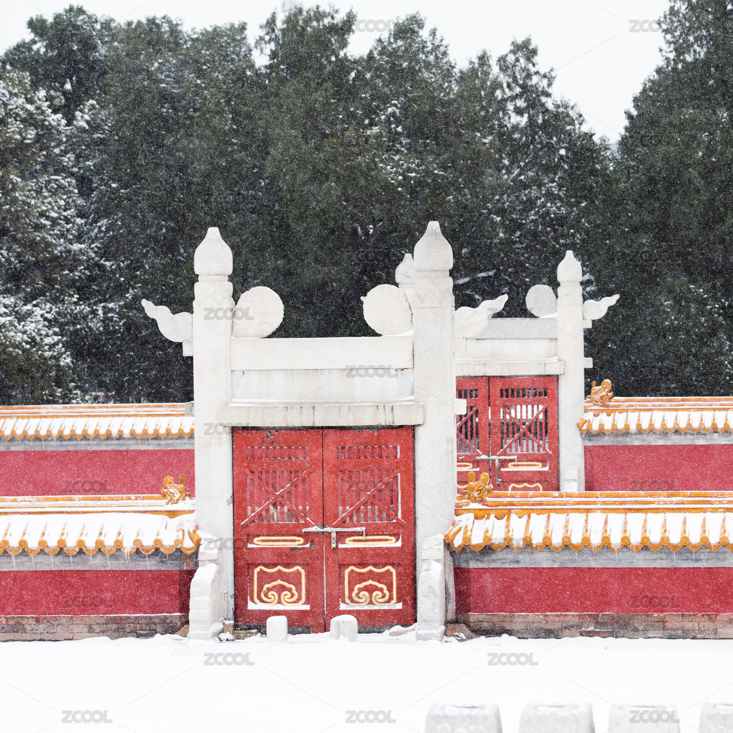 北京地壇公園雪中方澤壇東側(cè)雙柱欞星門