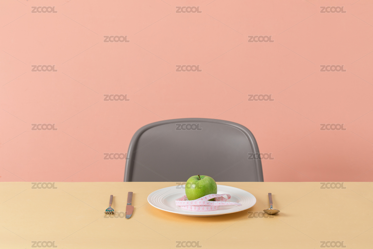 黃色桌面上有叉子刀碟蘋果和皮尺,桌邊還有一把椅子