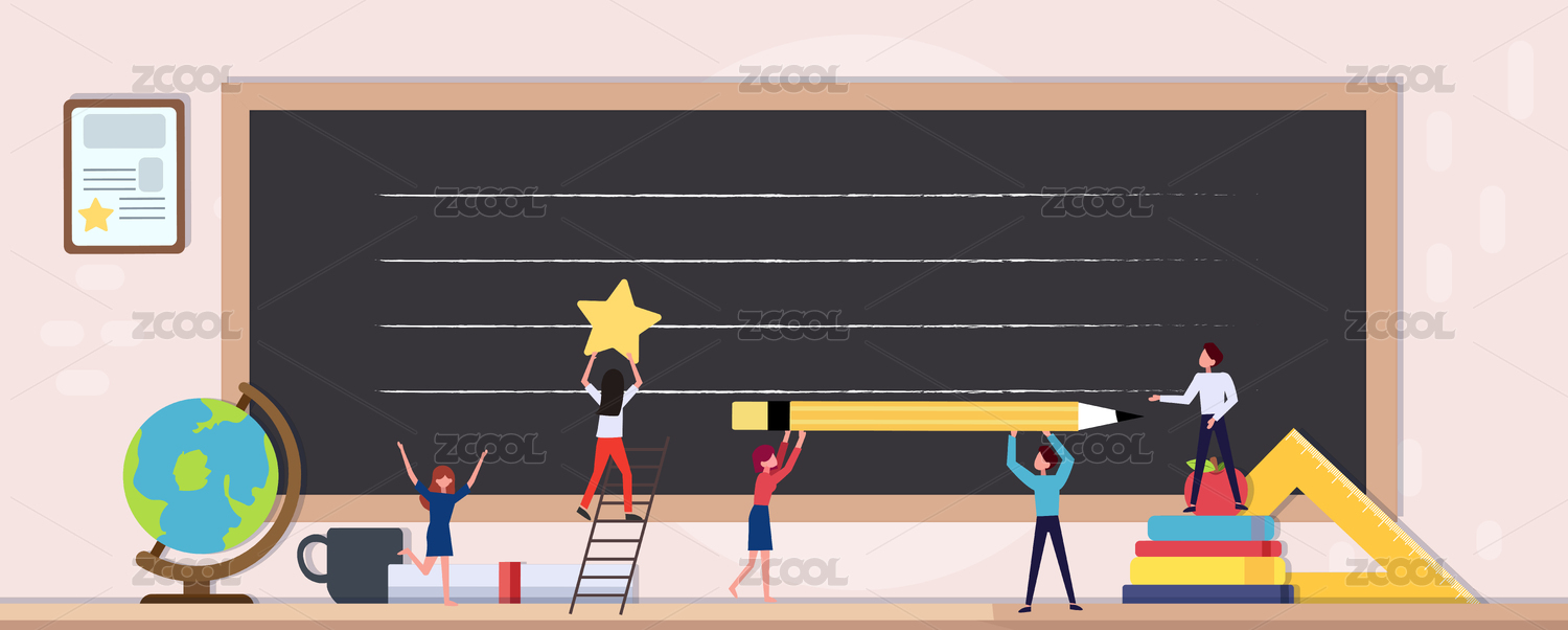 許多小人在桌面上的黑板格尺書本地球儀前面