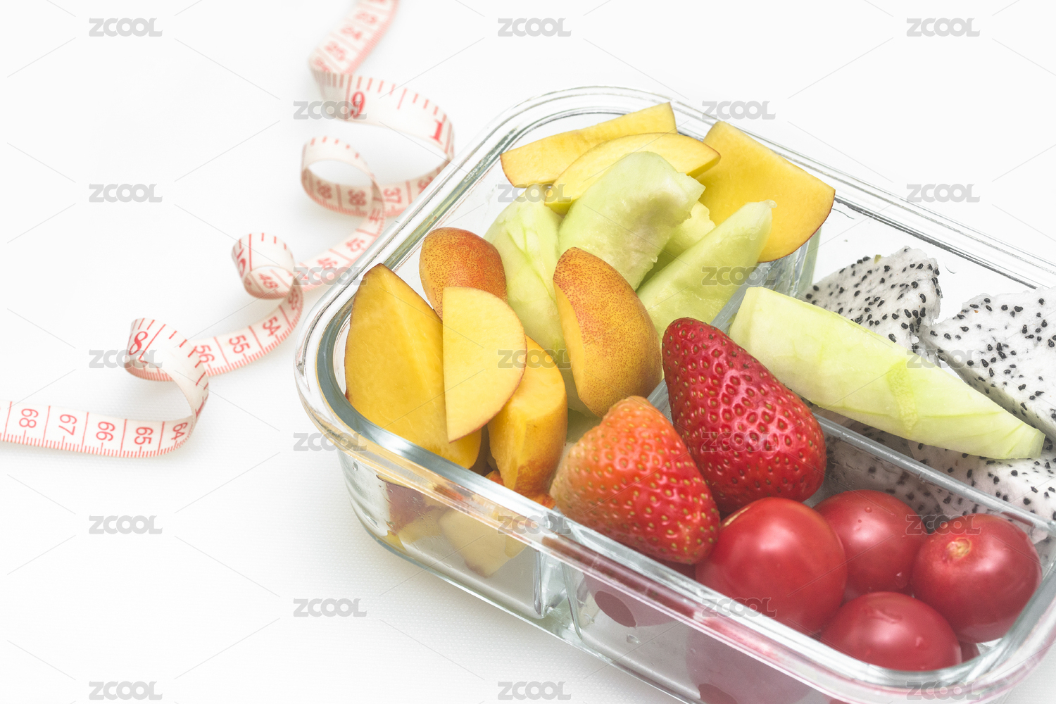 切好的各種水果組合由玻璃容器盛放,虛化的卷尺,放在白色背景上。