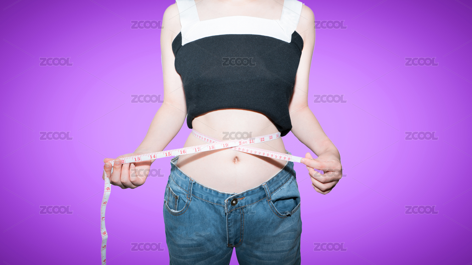 美女拿著皮尺卷尺測(cè)量自己的腰圍減肥概念