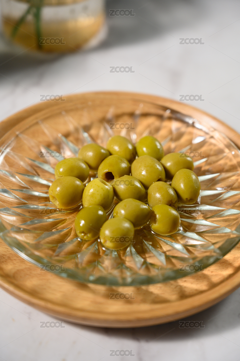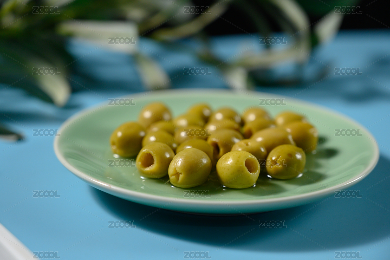 桌面上的盤子里的美味可口的青橄欖