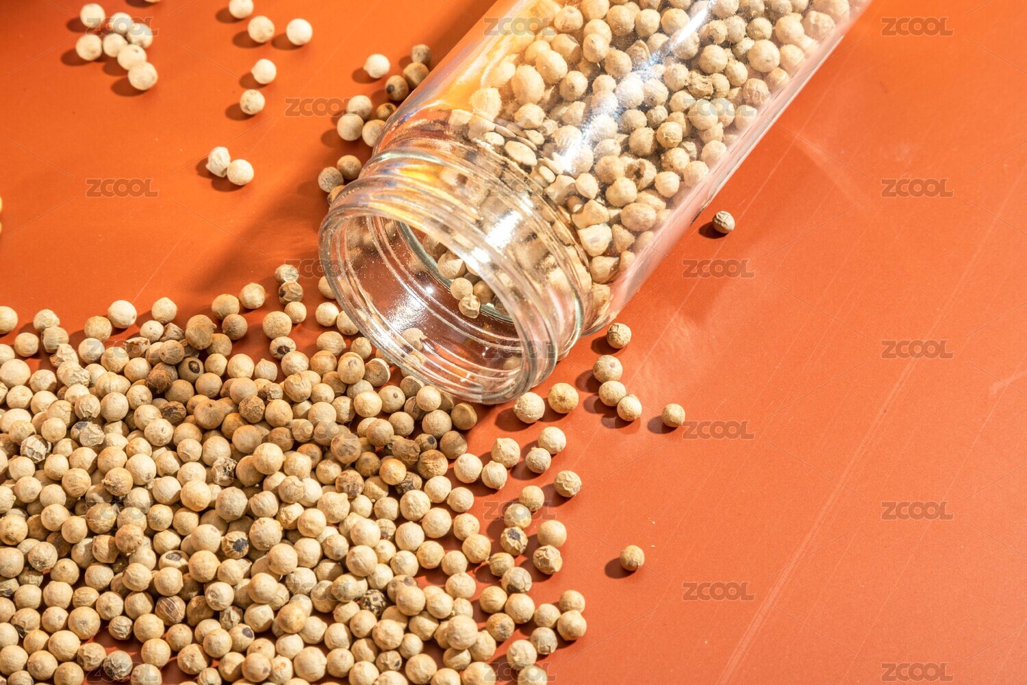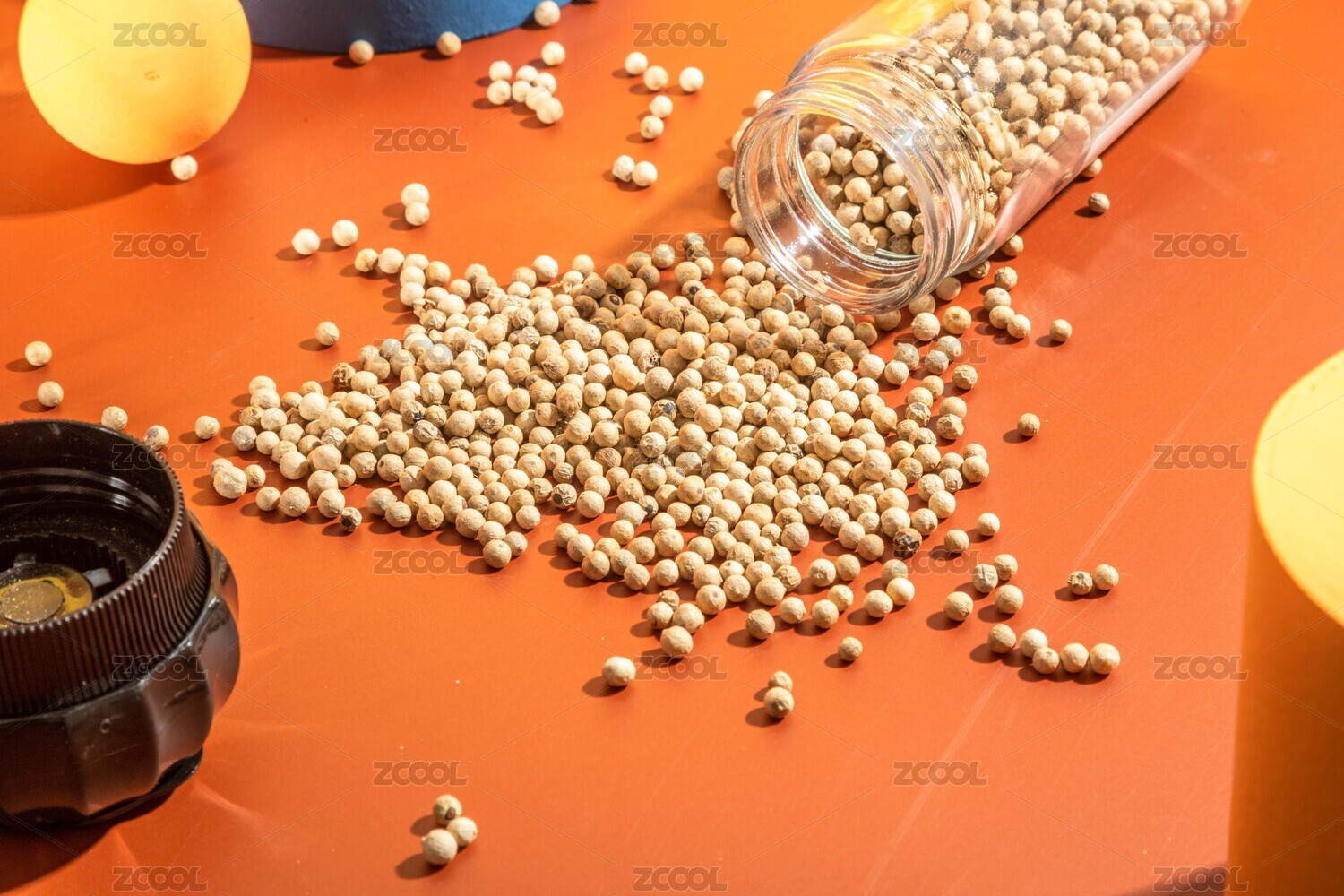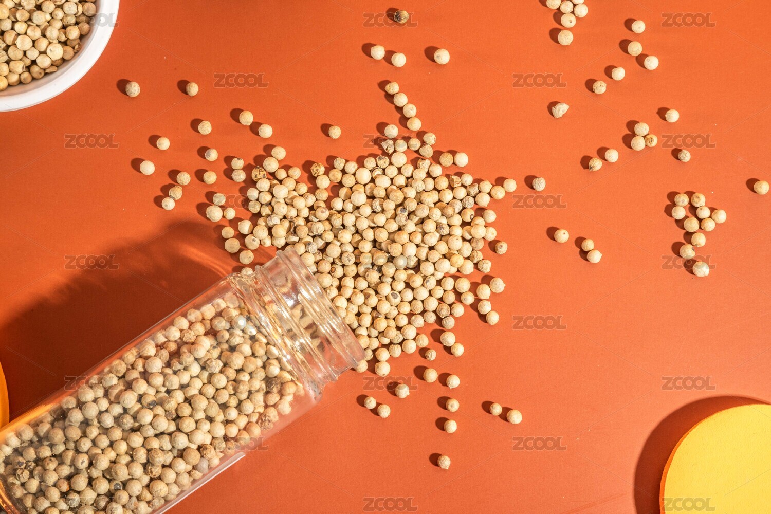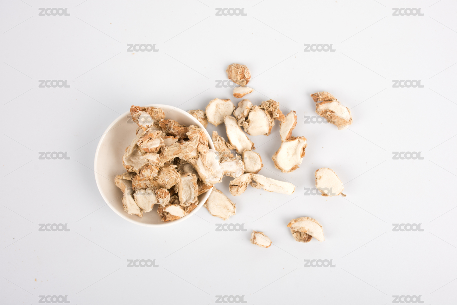 白瓷碟裝著中藥材沙姜片,旁邊還灑落在白色背景上