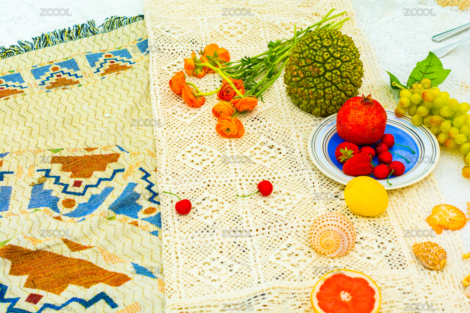在沙灘上享受美麗的風(fēng)景和吃新鮮的水果