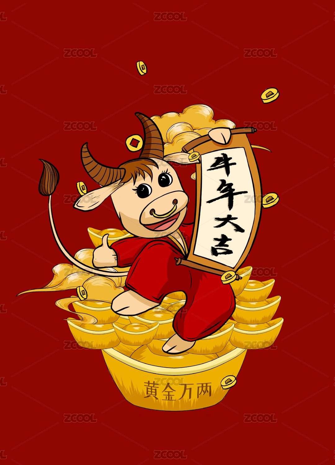 卡通牛牛站在金元寶手里拿著牛年大吉的卷軸