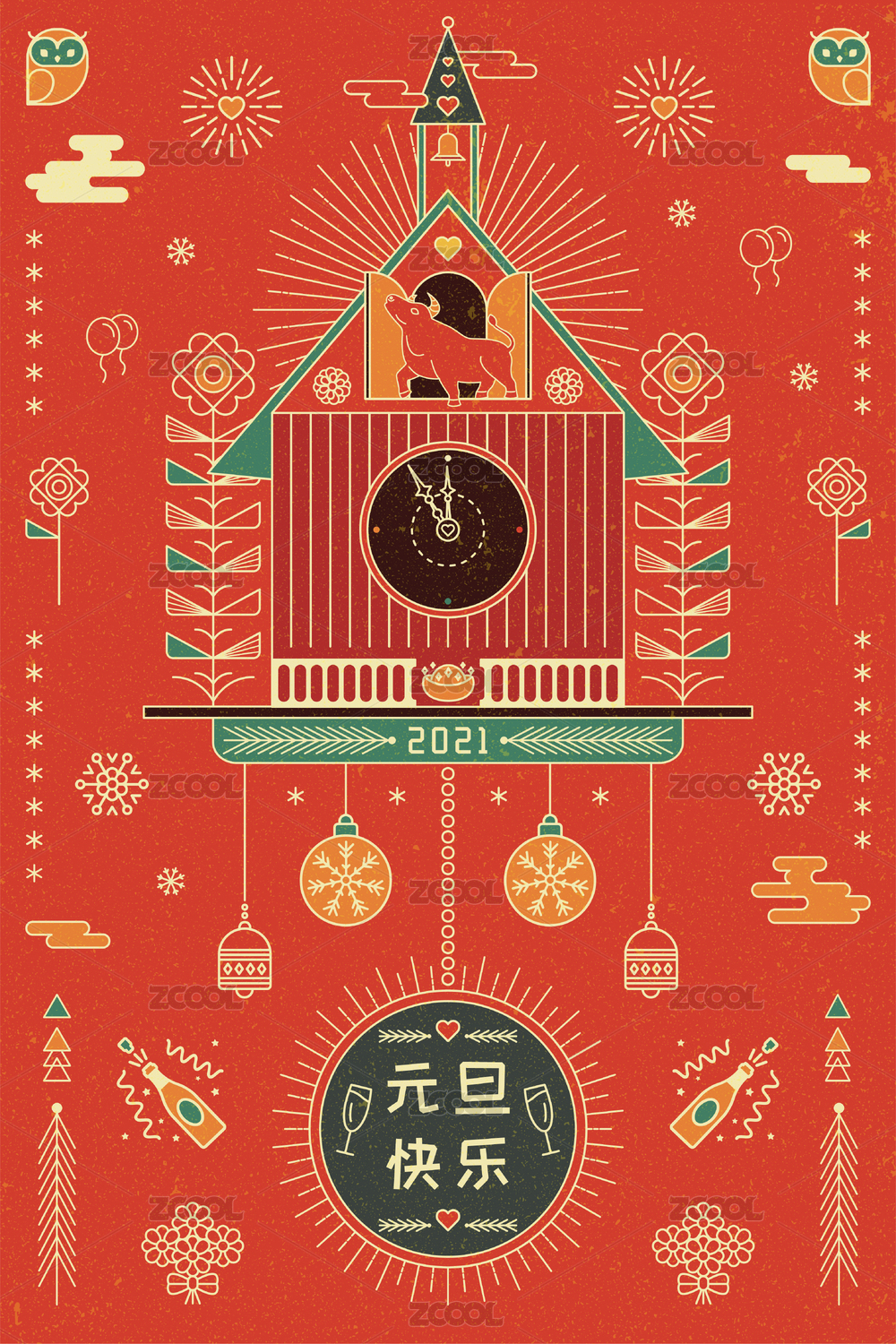 2021牛年新年元旦紅色時(shí)鐘線性海報(bào)設(shè)計(jì)
