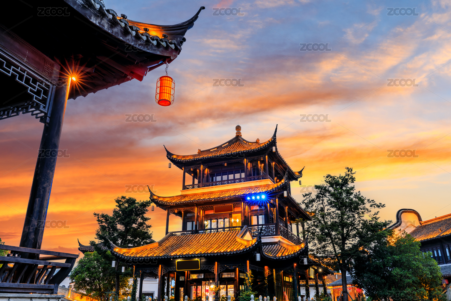 日落時(shí)陽(yáng)光照在中國(guó)古代木制建筑