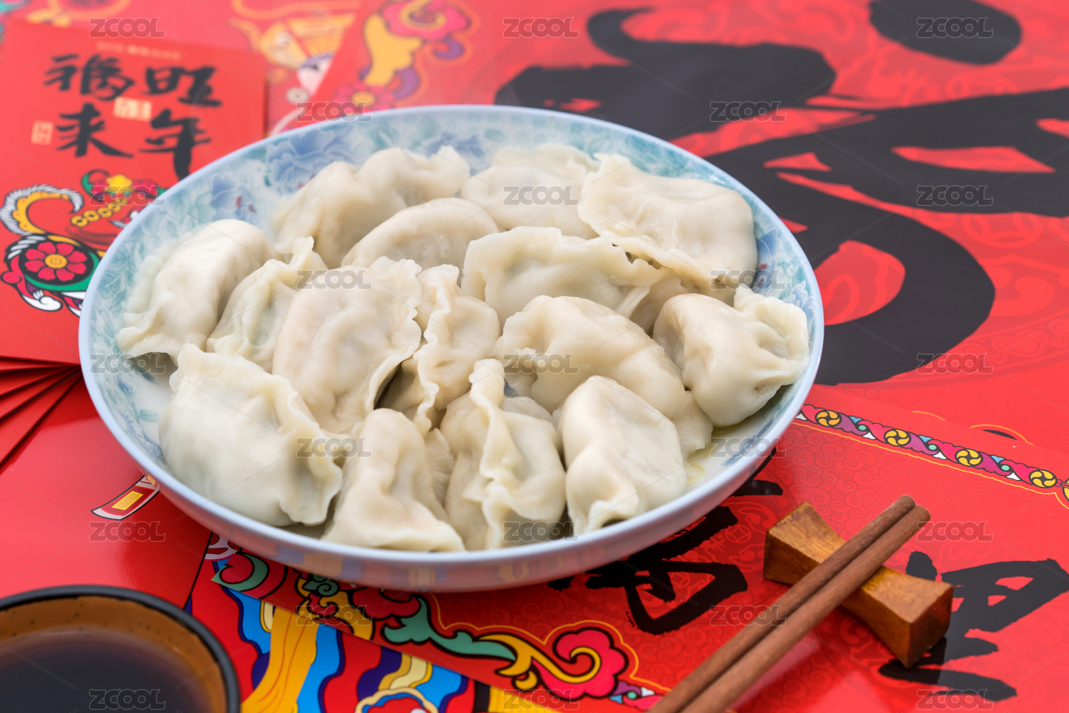 春節(jié)紅色對聯(lián)背景下的一盤餃子