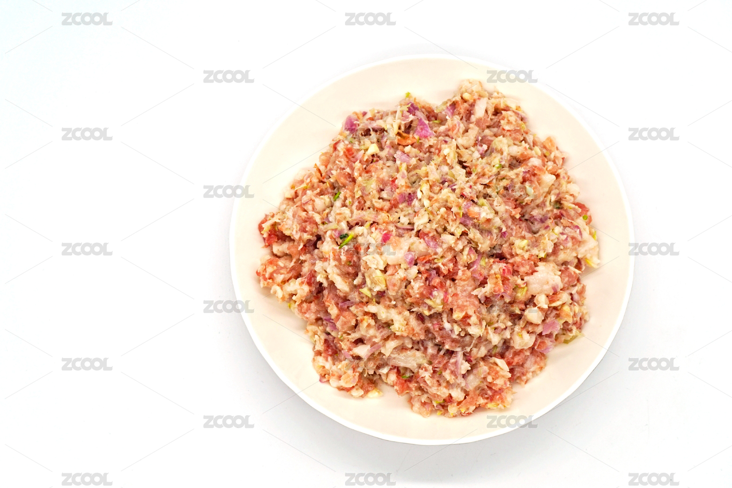 白色背景中一盤餃子餡豬肉餡特寫