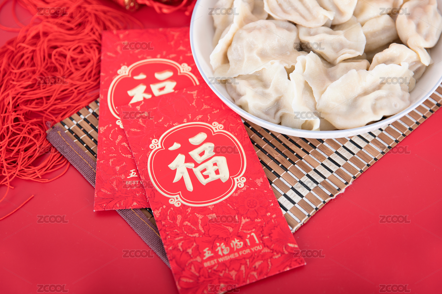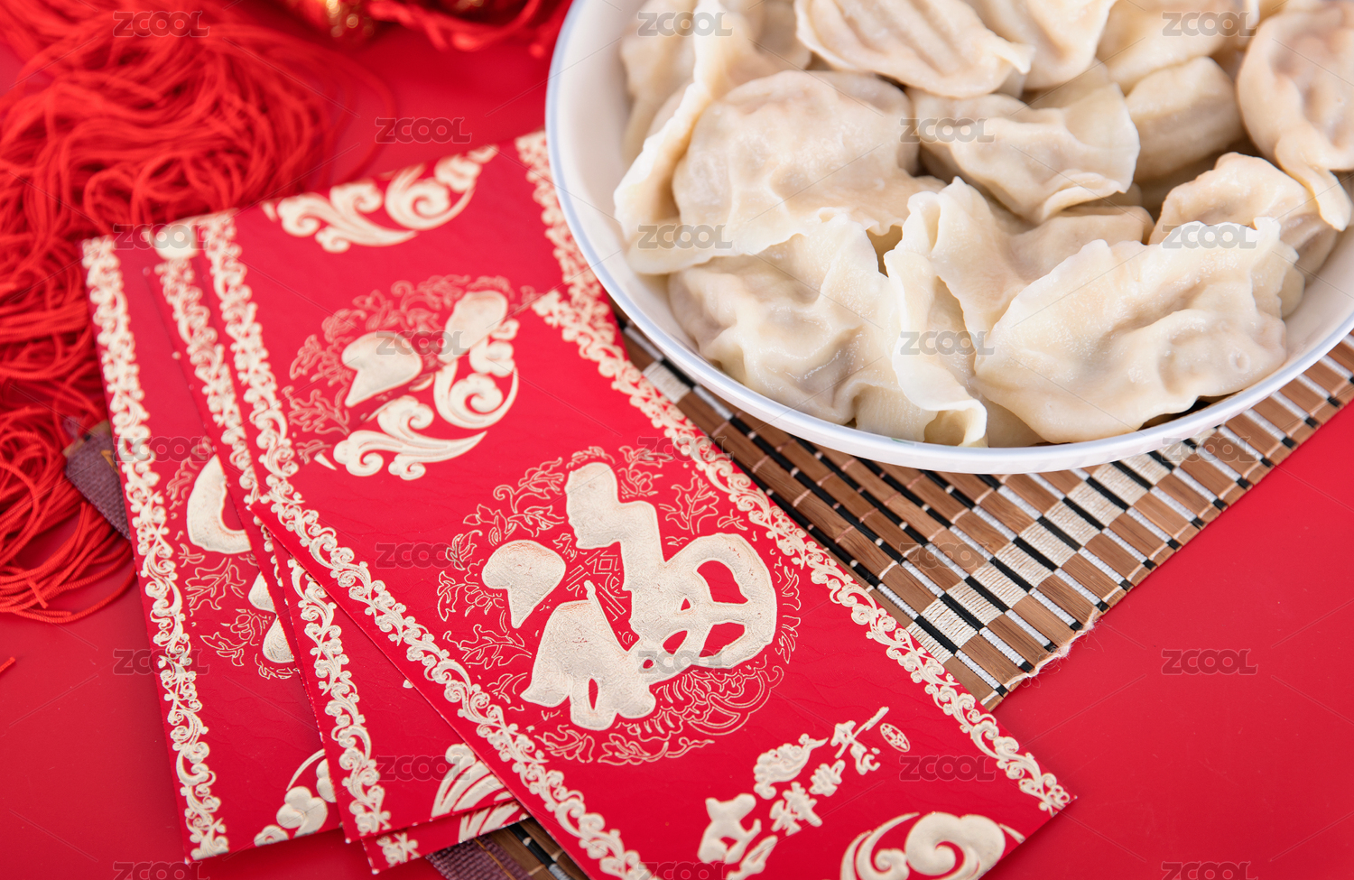 俯拍春節(jié)紅色對聯(lián)背景下的一盤餃子