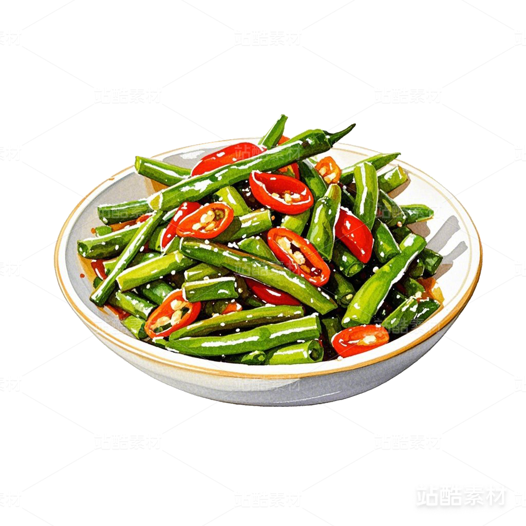 辣椒炒豆角水彩手繪美食素材