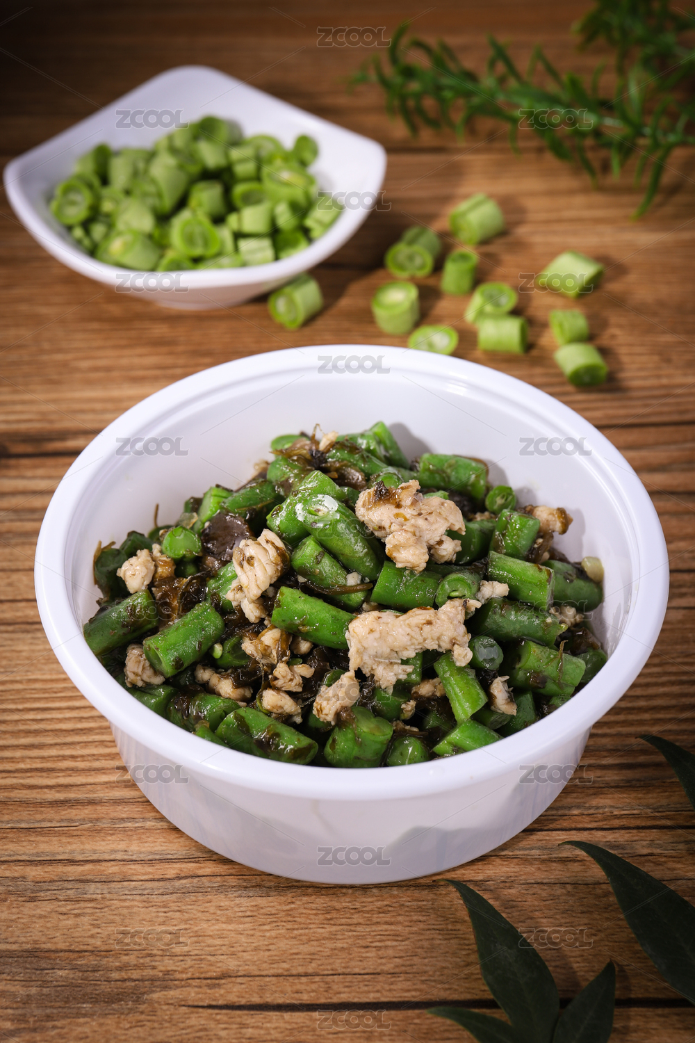 木紋背景上碗里的肉末豆角