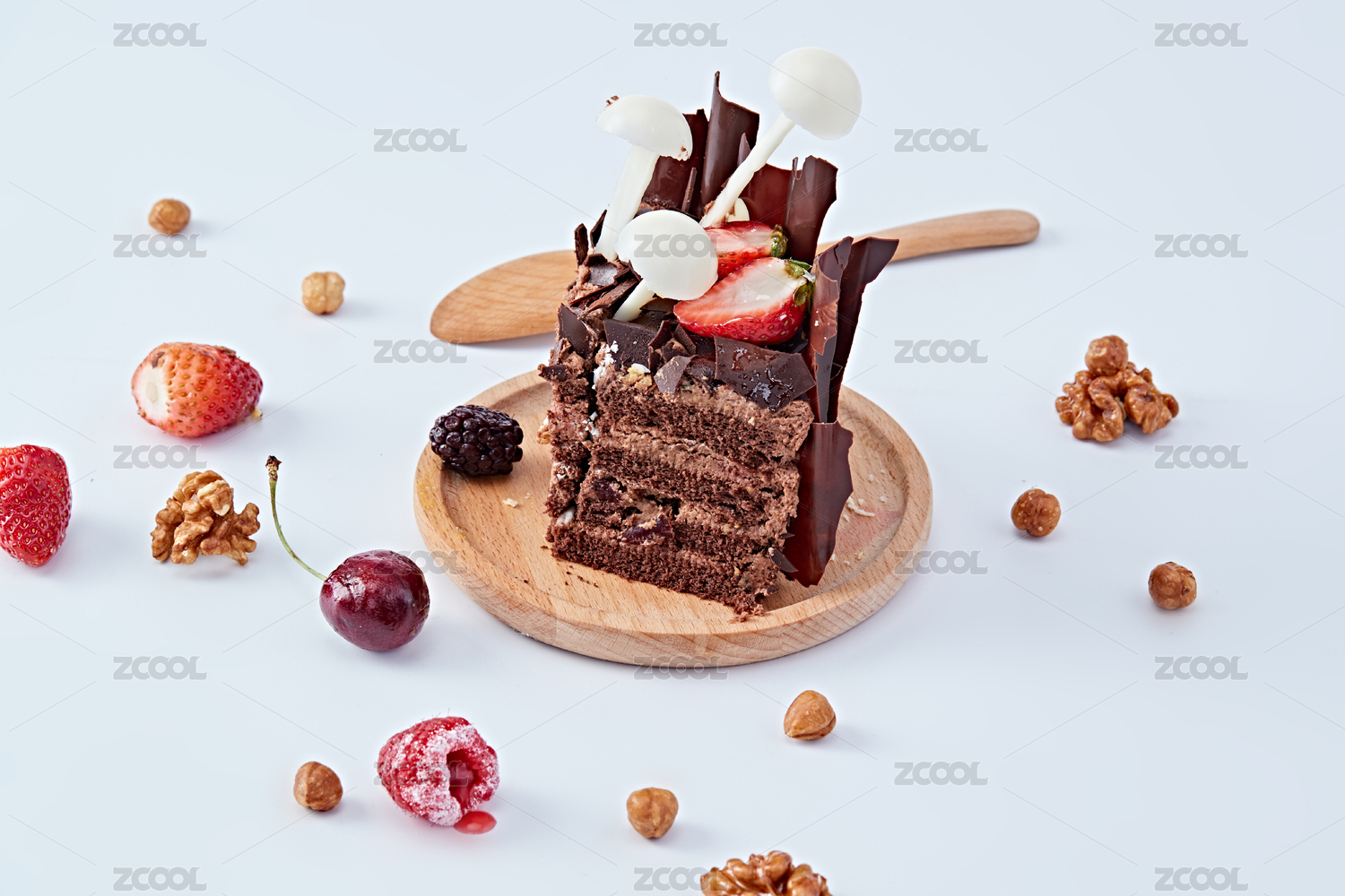 白色調(diào)的背景里放著一盤巧克力生日蛋糕