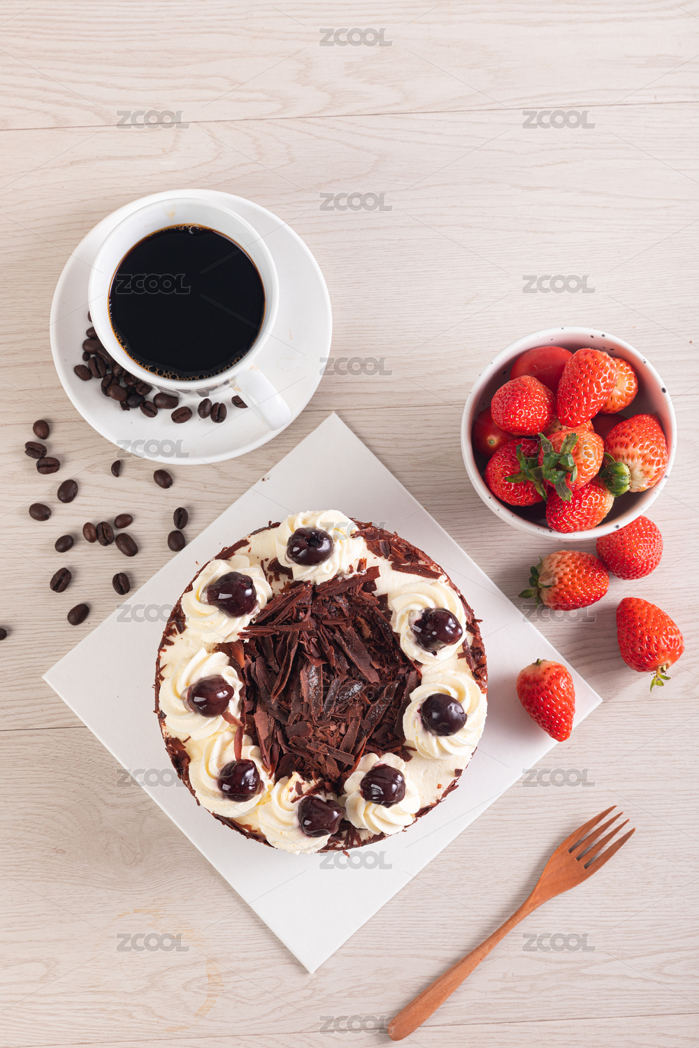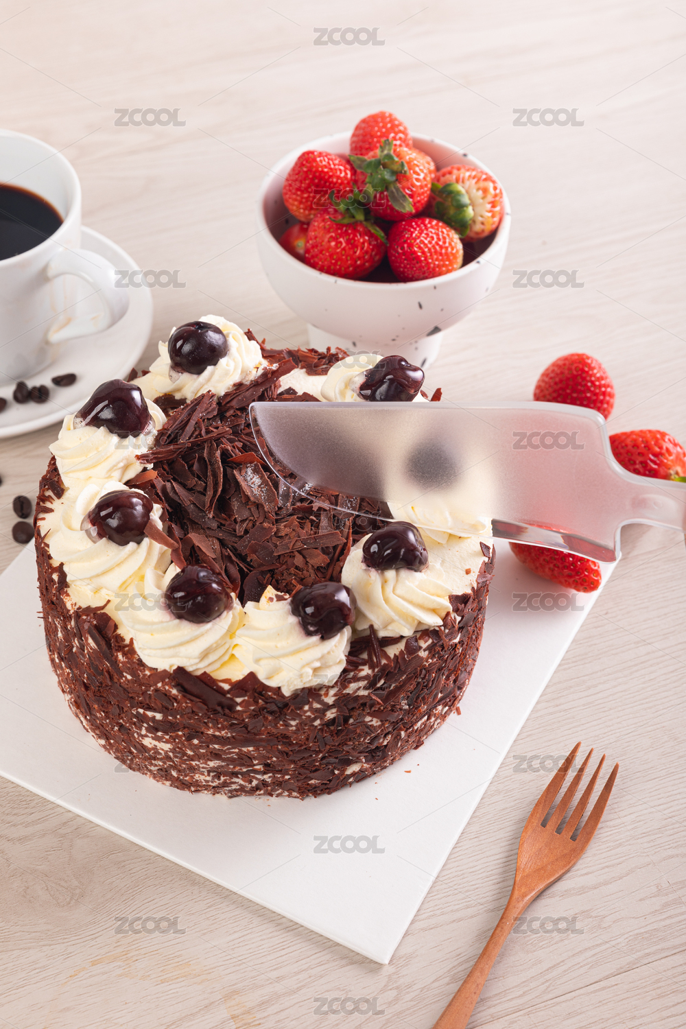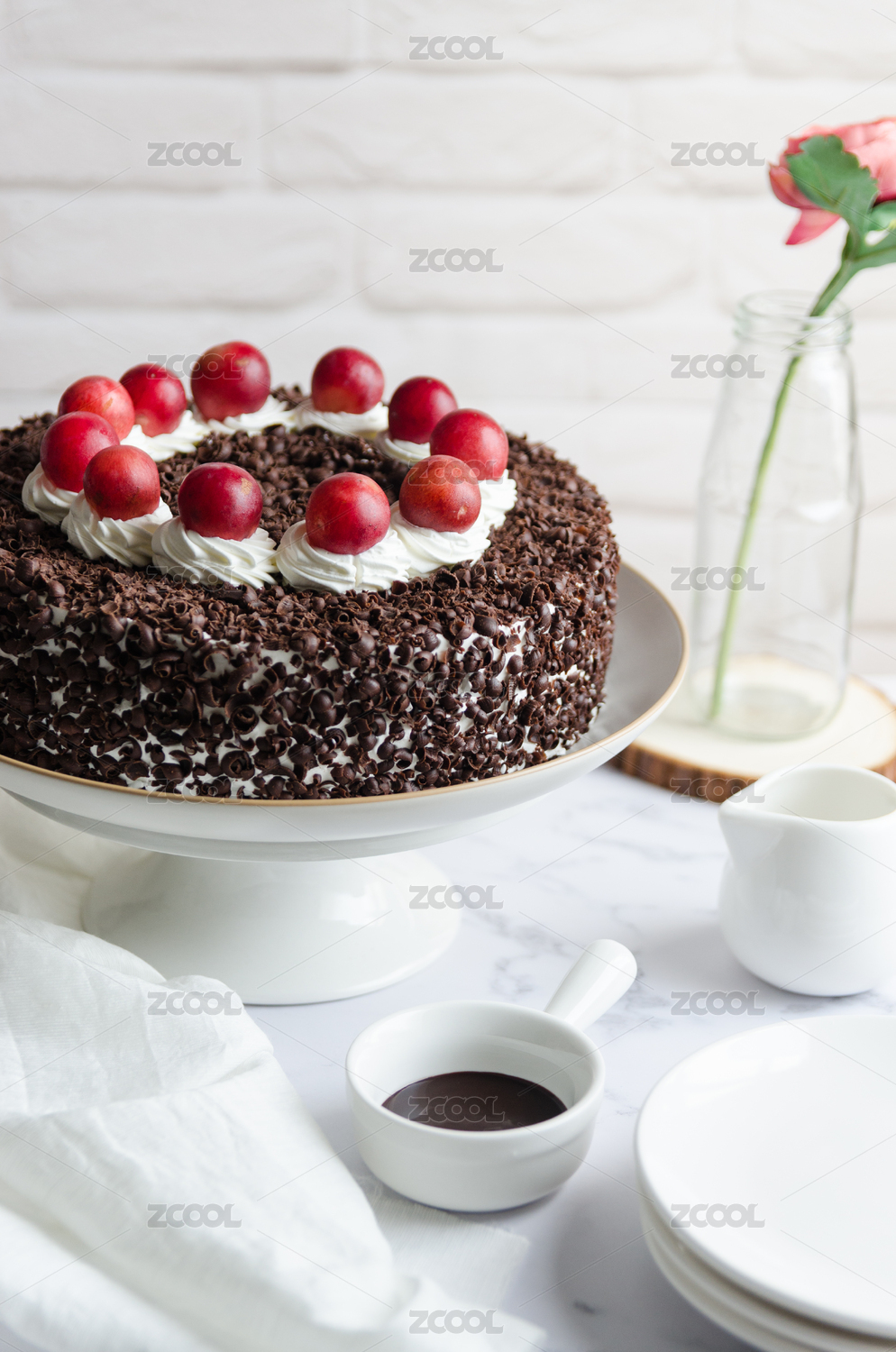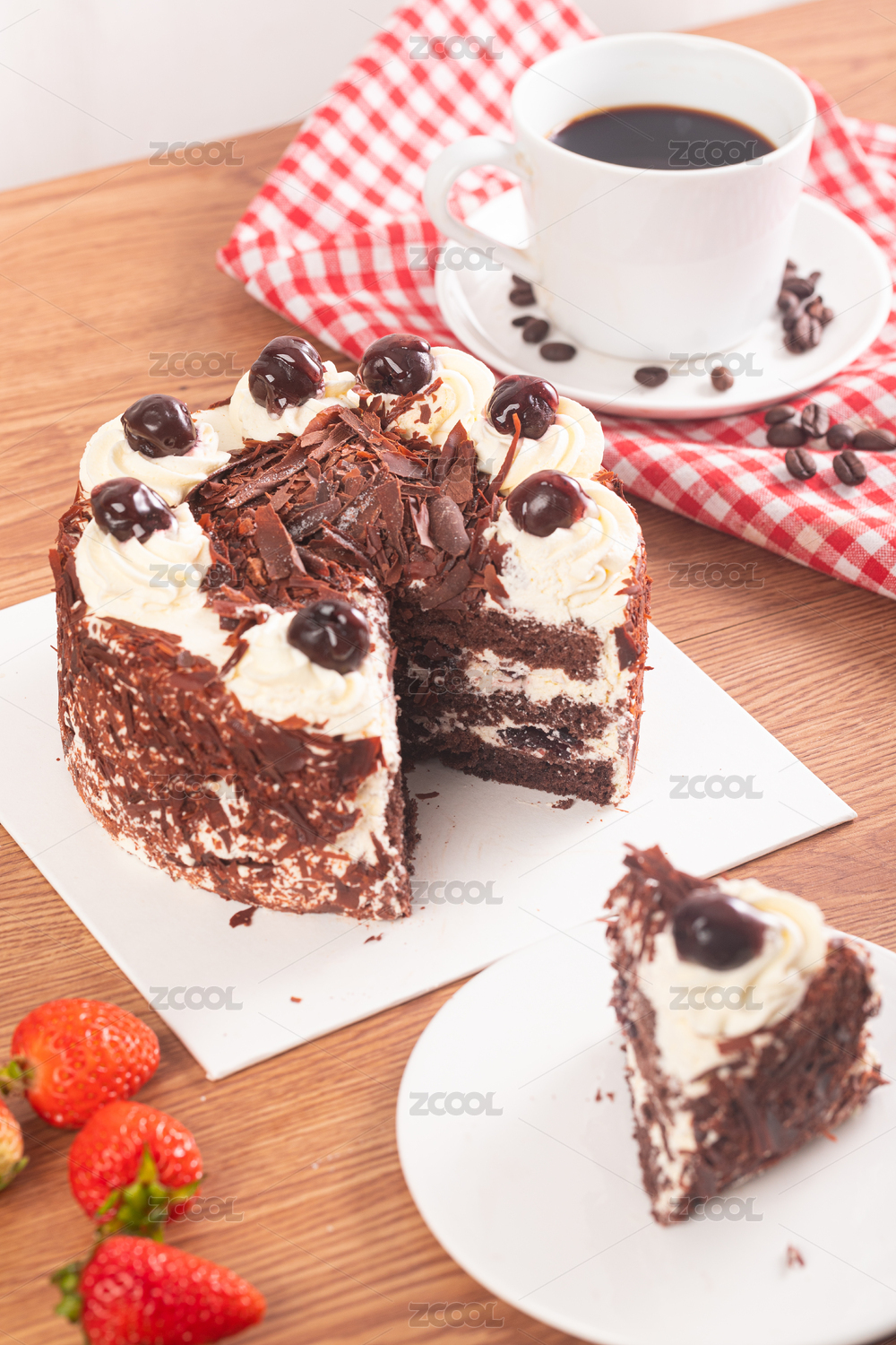 一個(gè)黑森林巧克力生日蛋糕放在桌子上