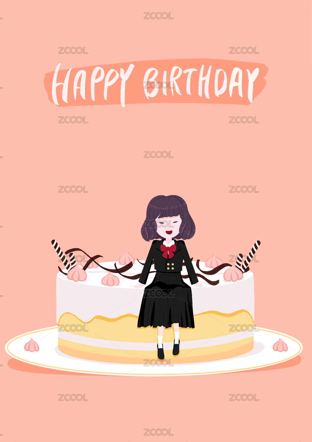 女孩和奶油巧克力生日蛋糕插畫