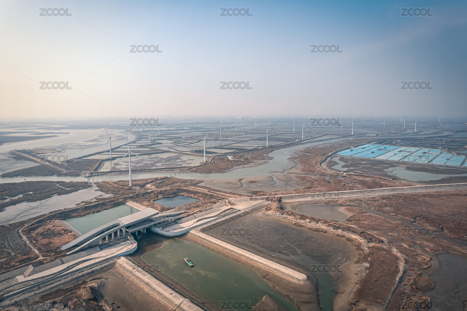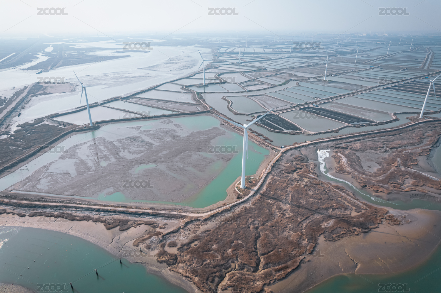 俯瞰??诤0哆吪懦梢痪€轉(zhuǎn)動著的風(fēng)力發(fā)電機