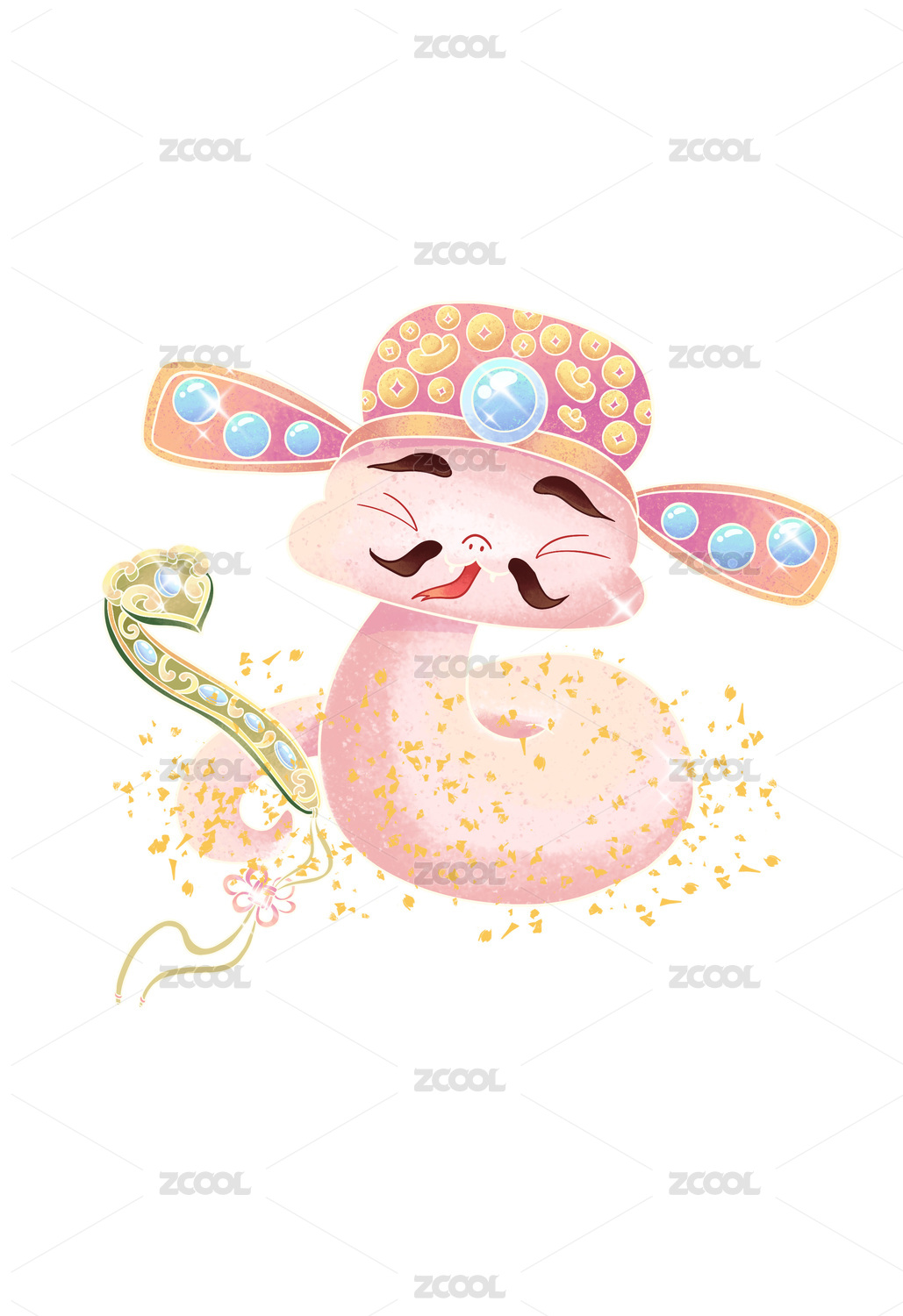 戴財神帽的中國蛇年生肖形象與如意元寶