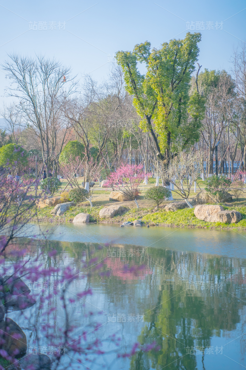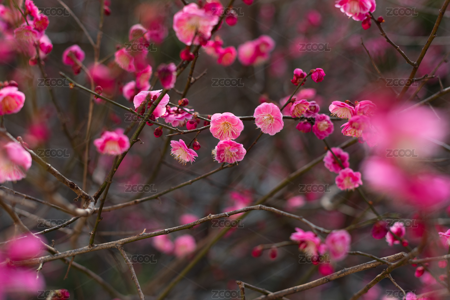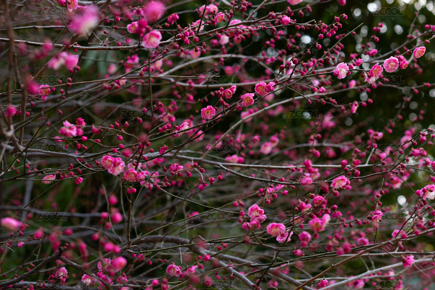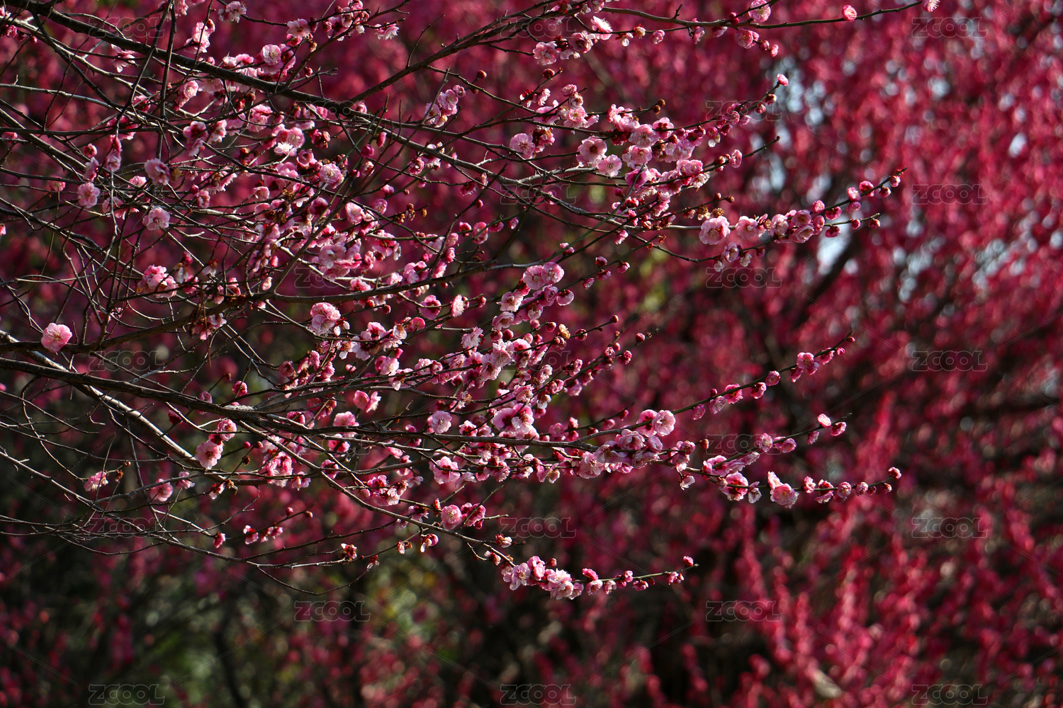 早春時節(jié)游人在山間梅林間徒步賞景漫山粉梅春日山野